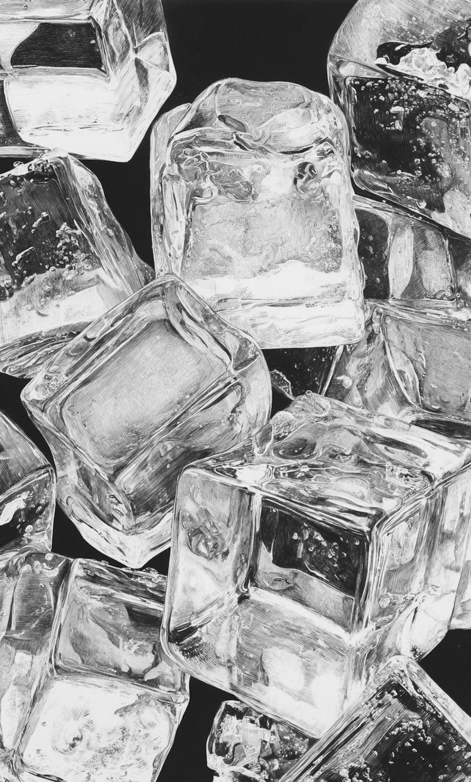 Close-up black-and-white illustration of detailed ice cubes with intricate textures and reflections against a dark background.