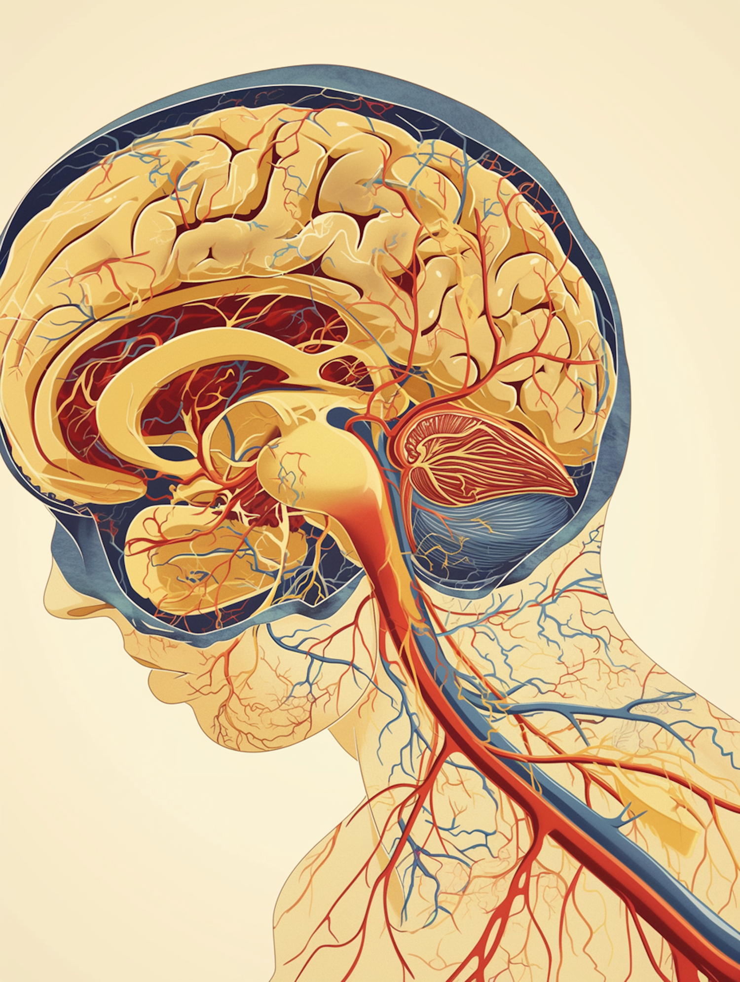 Detailed anatomical illustration of the human brain, highlighting blood vessels and nerves in vivid colors against a beige background.