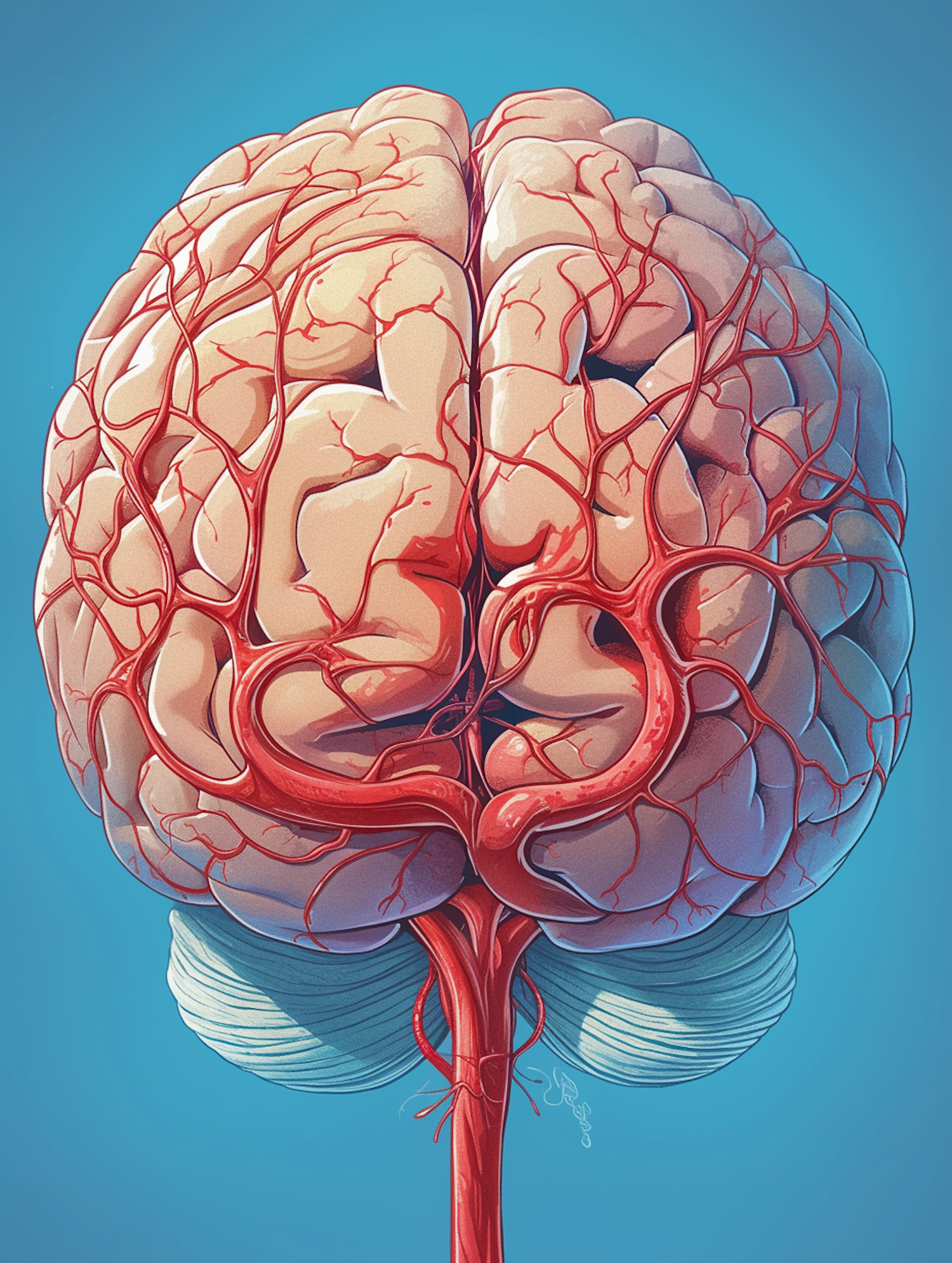 Intricate illustration of a human brain with detailed blood vessels on a blue background, showcasing cerebral complexity.