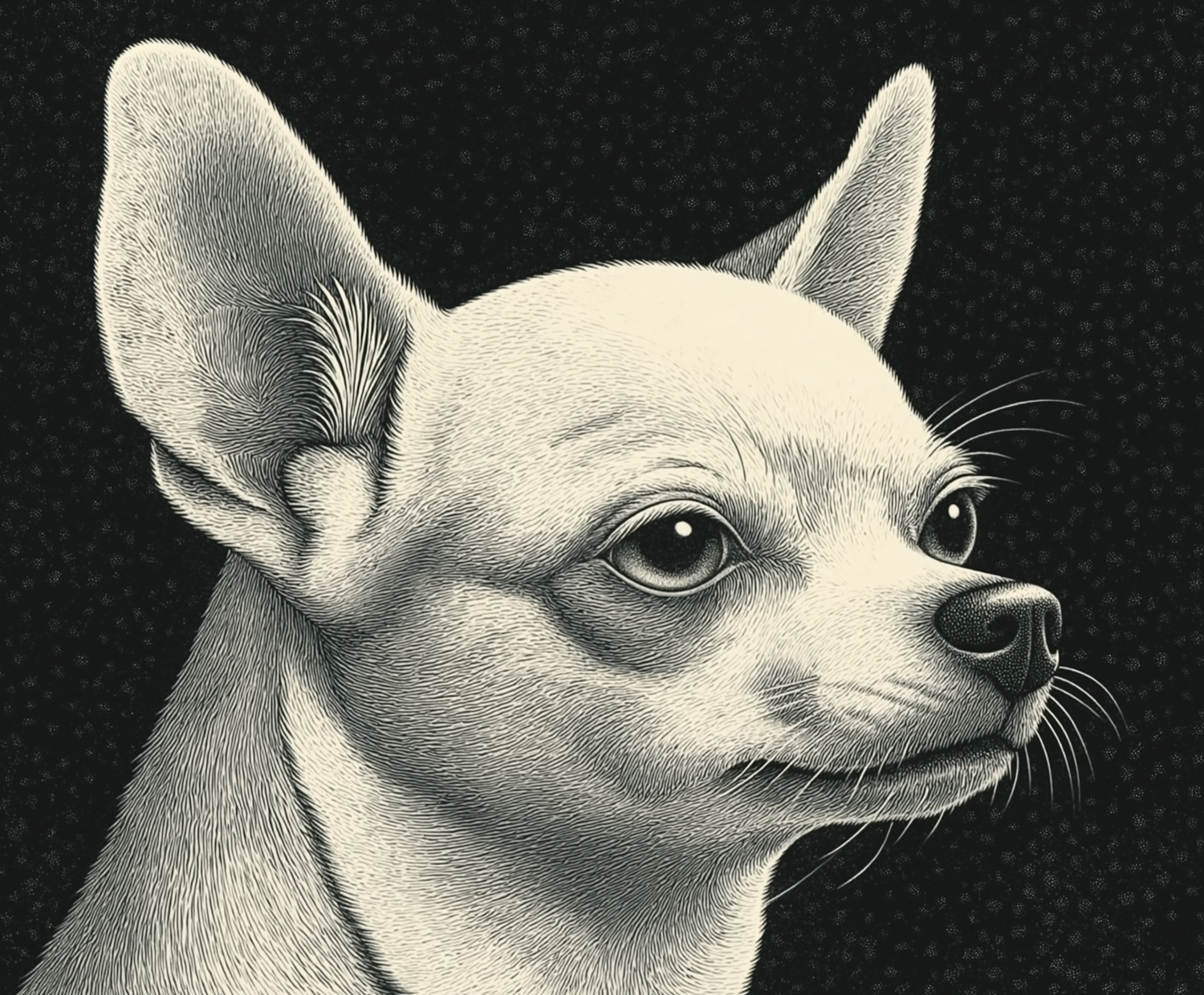 Intricate illustration of a Chihuahua with expressive eyes and detailed fur, set against a dark background.