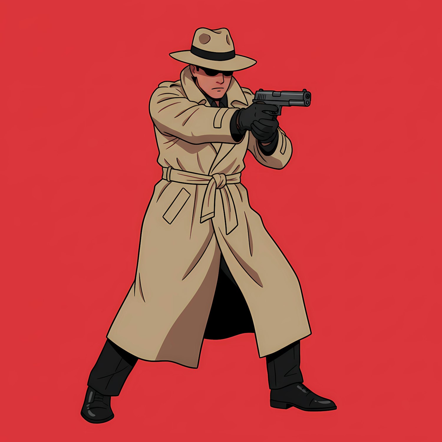Illustration of a detective in a trench coat and fedora, holding a pistol, set against a bold red background.