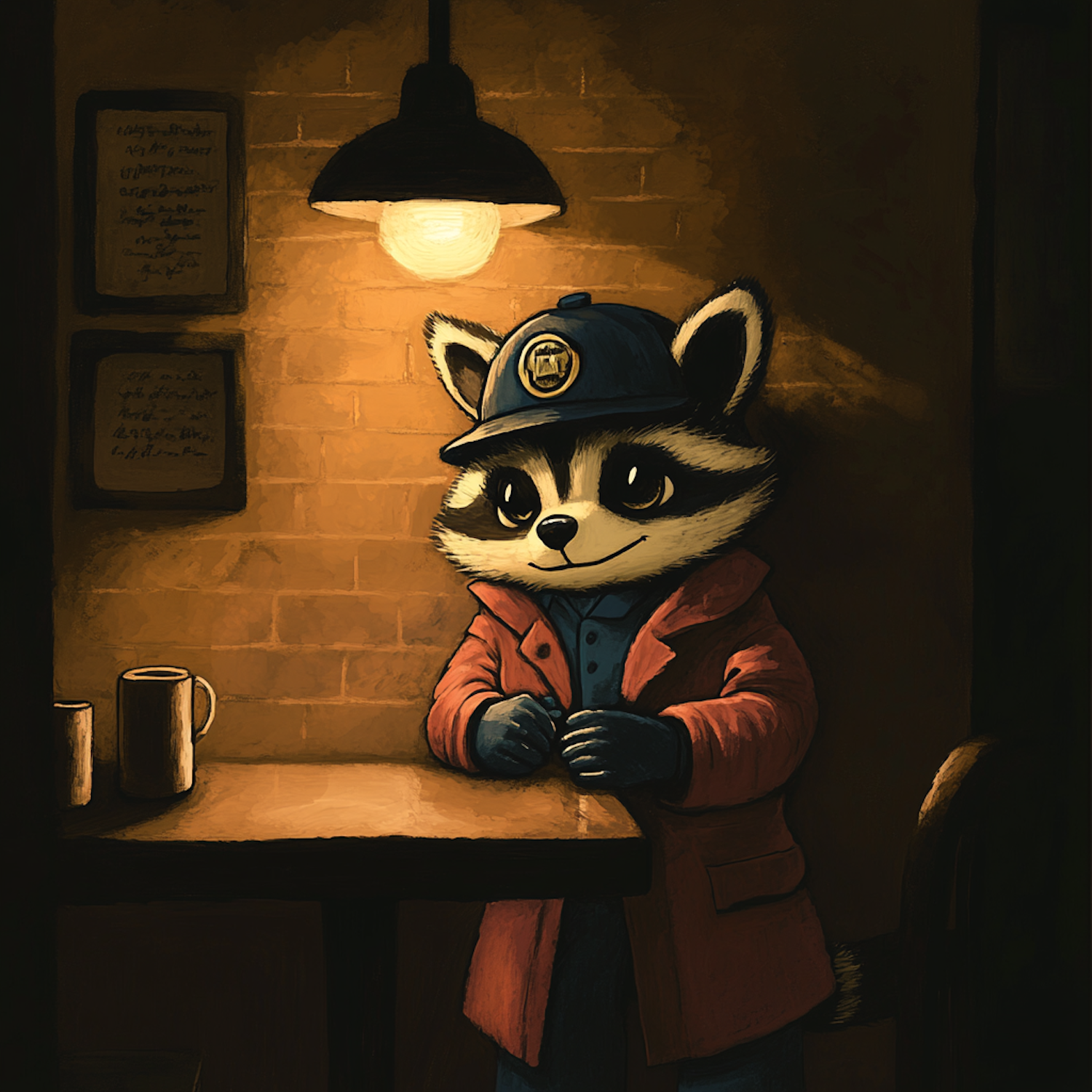 Charming raccoon in detective attire under warm light, leaning on a table with mugs, creating a cozy atmosphere.
