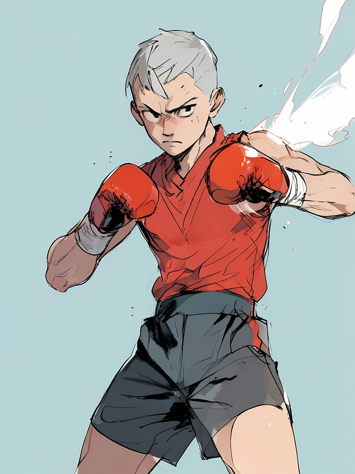 Dynamic illustration of a young boxer with white hair, red gloves, and a determined expression, set against a light blue background.