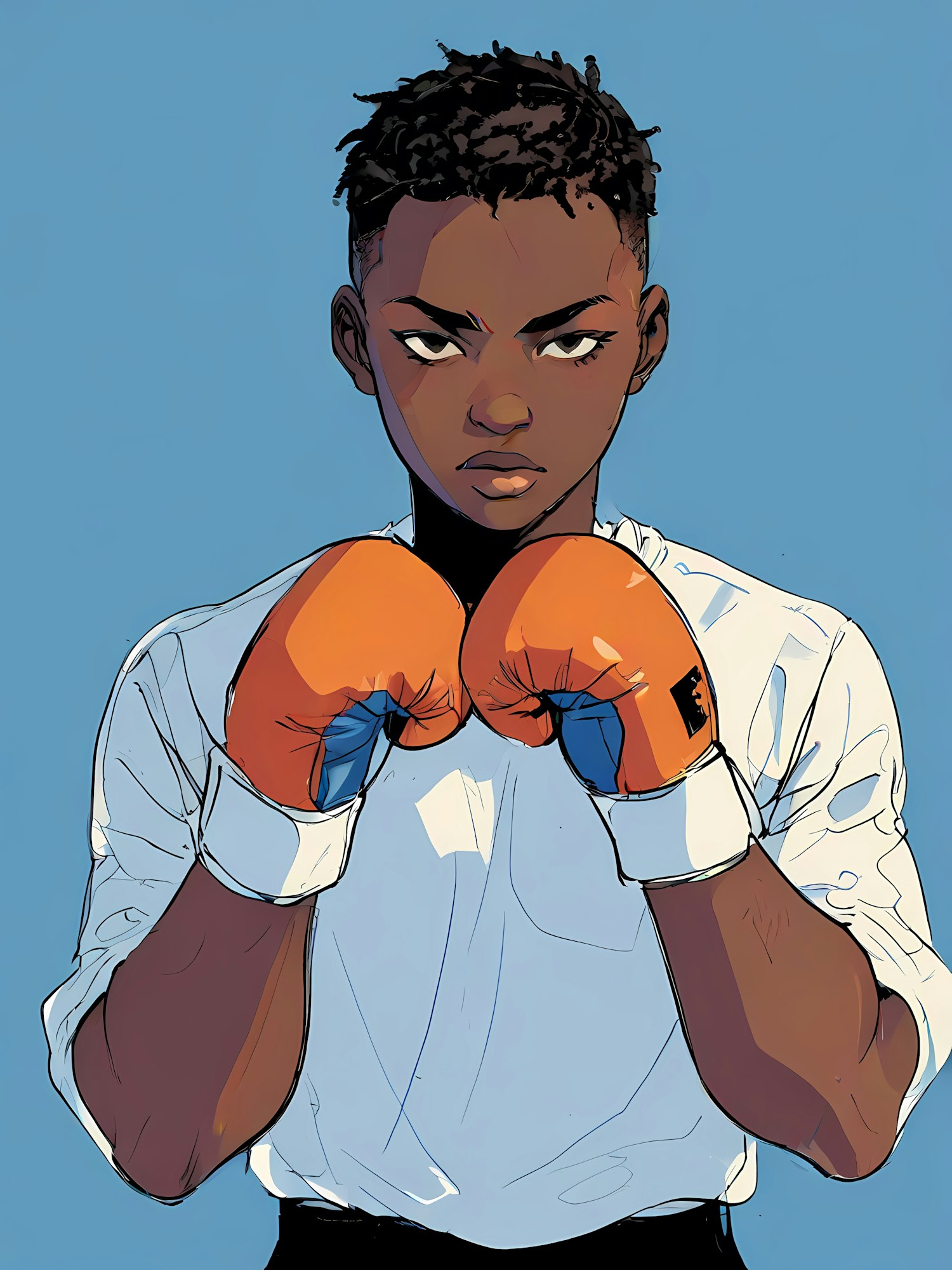 Illustration of a young boxer with orange gloves and a determined expression against a blue background.