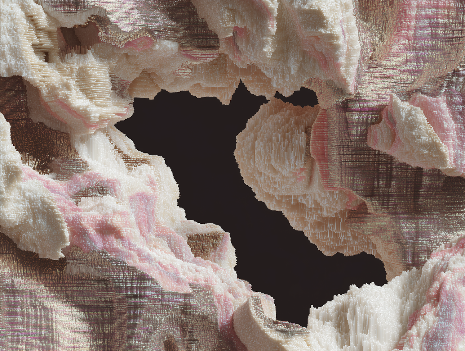 Abstract 3D-rendered cavern-like structure with intricate cream, pink, and beige layers, creating a digital and organic aesthetic.