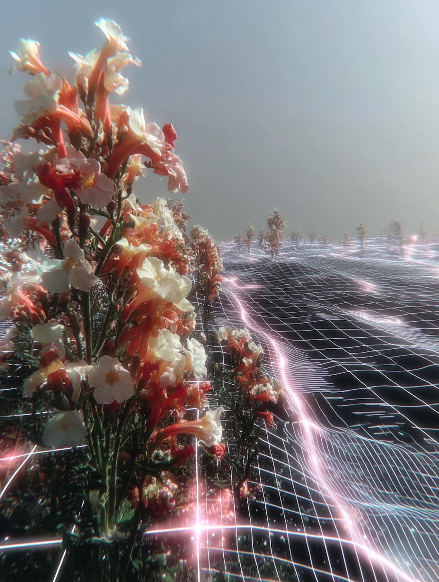 A surreal blend of vibrant flowers and a glowing digital grid, merging nature with futuristic aesthetics in a dreamlike scene.