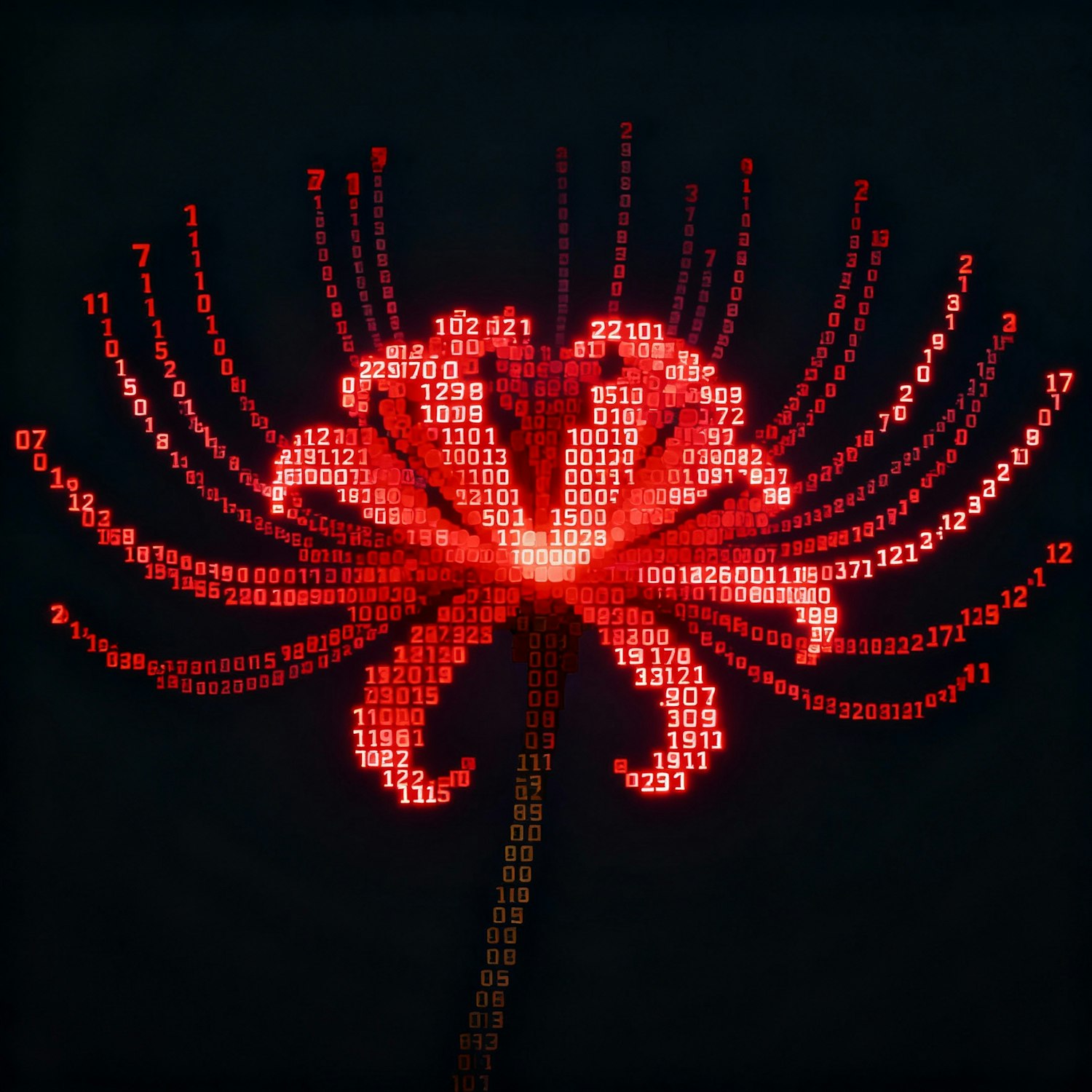 A glowing red digital flower made of numbers on a dark background, blending technology and nature in a striking visual.