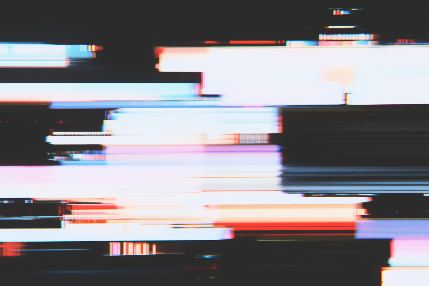 Abstract glitch art with vibrant streaks of white, blue, pink, and red on a dark background, evoking a digital error aesthetic.