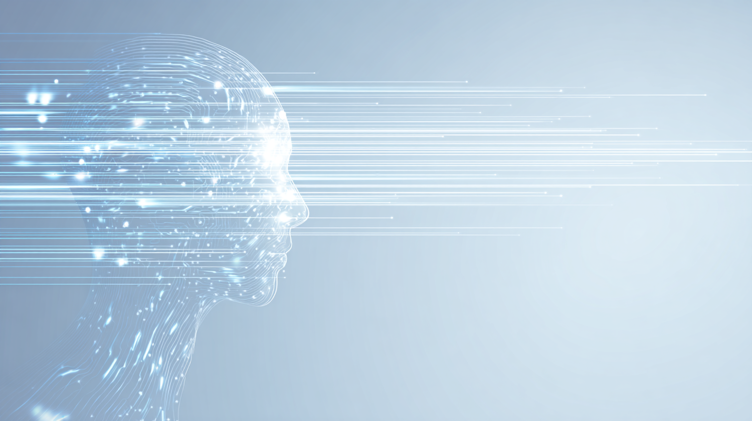 Futuristic digital illustration of a human head profile with glowing lines and data streams, symbolizing technology and connectivity.