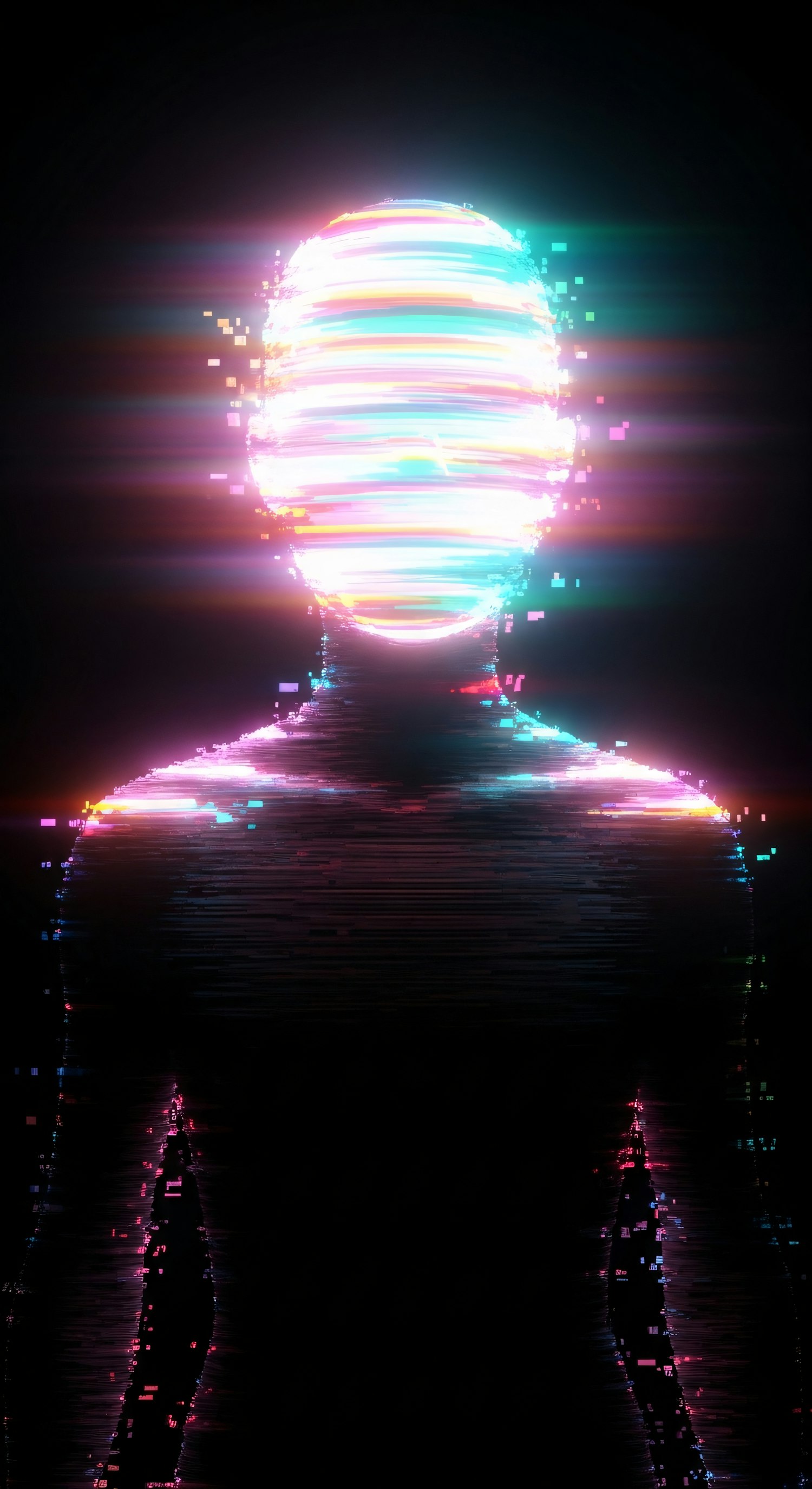 A glowing humanoid figure made of colorful light streaks and pixels against a dark background, evoking a futuristic digital theme.
