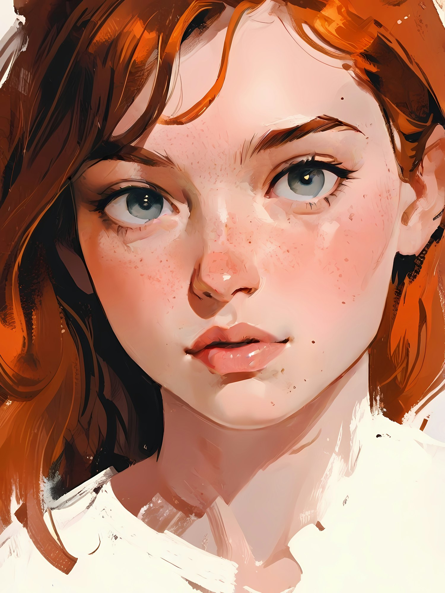 Digital portrait of a person with red hair and freckles against a soft, abstract background, showcasing a contemporary artistic style.