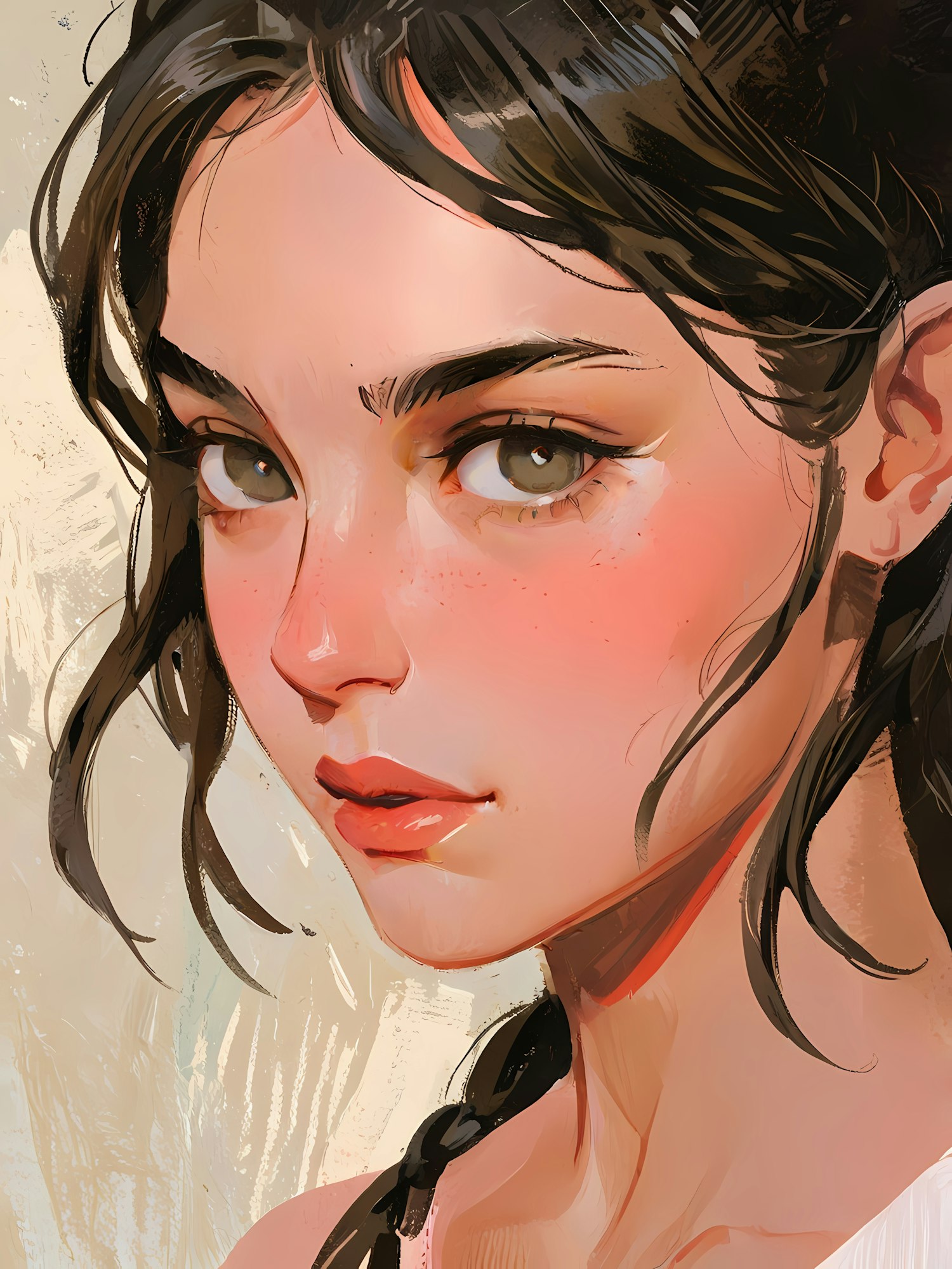 Digital illustration of a serene young woman with light blush, green eyes, and dark wavy hair, set against a pastel textured background.