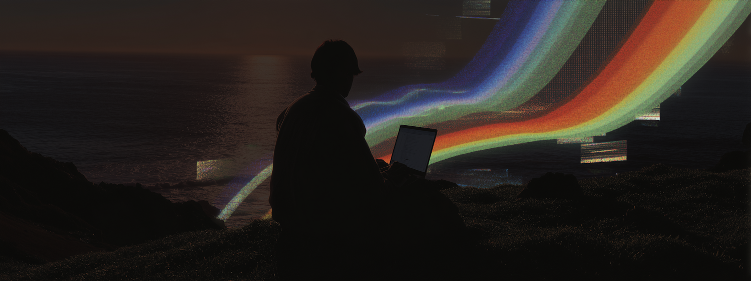 A silhouette of a person with a laptop on a hill, vibrant light trails, and an ocean backdrop under a dark sky.