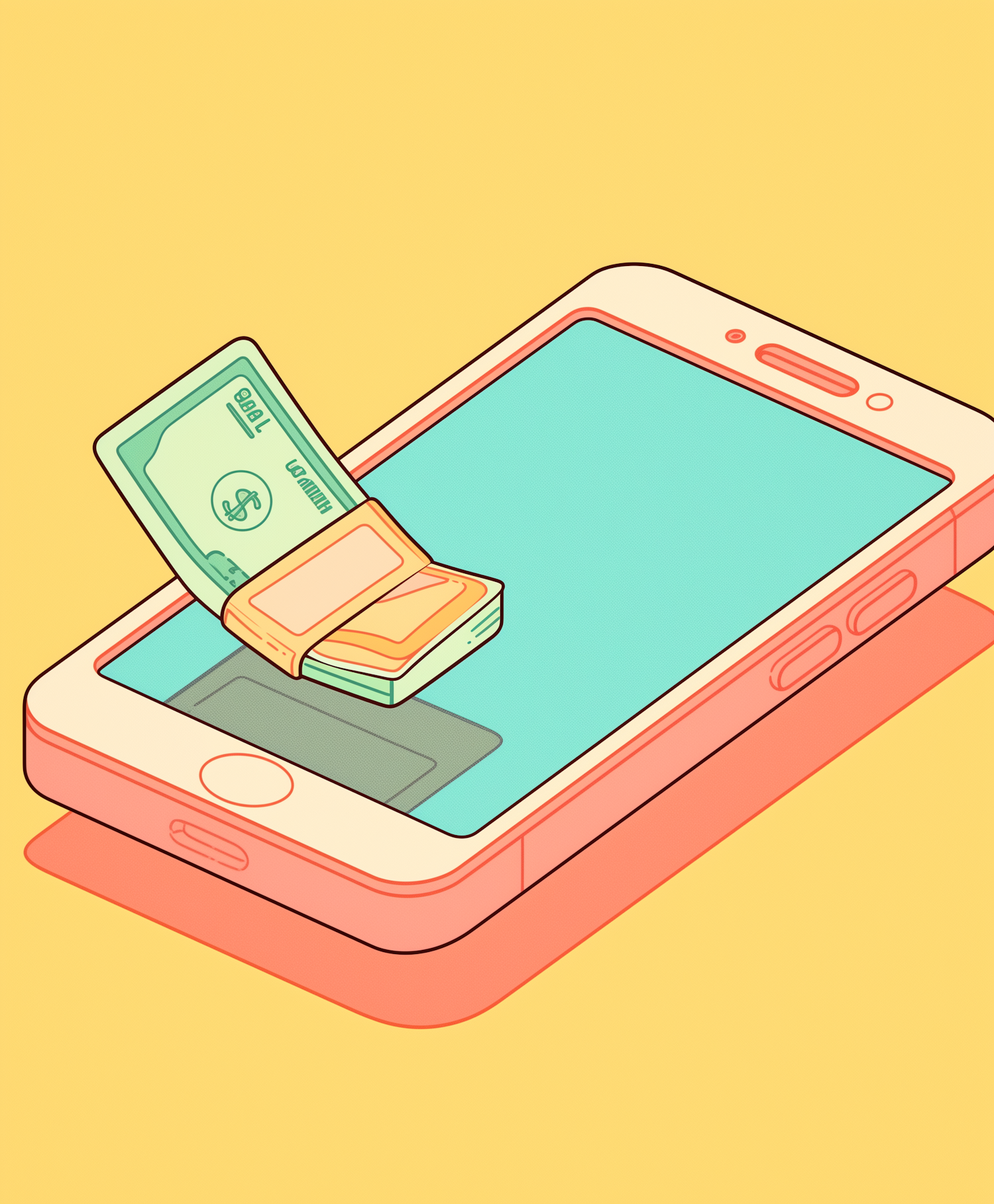 Illustration of a smartphone with cash emerging, symbolizing digital transactions. Bright colors and minimalistic design enhance the concept.
