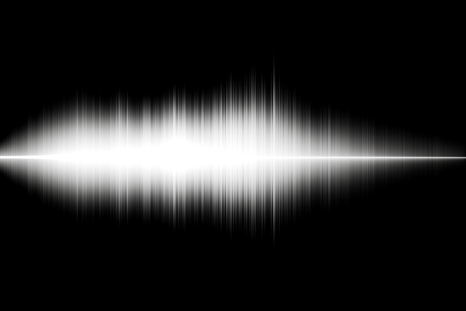 White digital waveform on a black background, symbolizing sound or audio visualization with sharp peaks and a bright central focus.