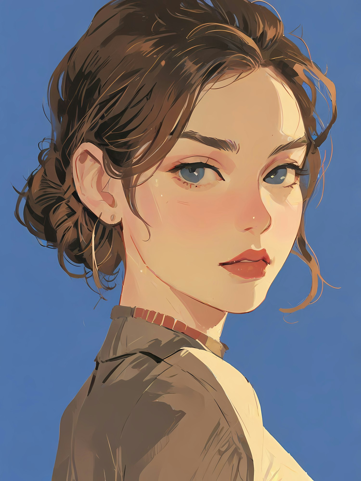 A beautifully crafted digital illustration of a woman with captivating blue eyes, styled hair, and delicately blushed features on a blue background.