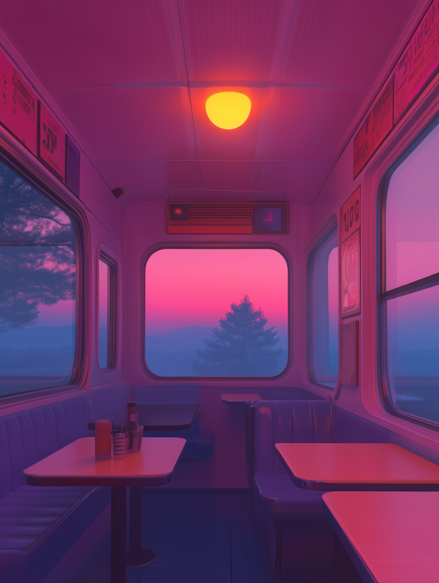 A tranquil train compartment with warm lighting and a stunning sunset view, featuring plush seating and nostalgic decor.