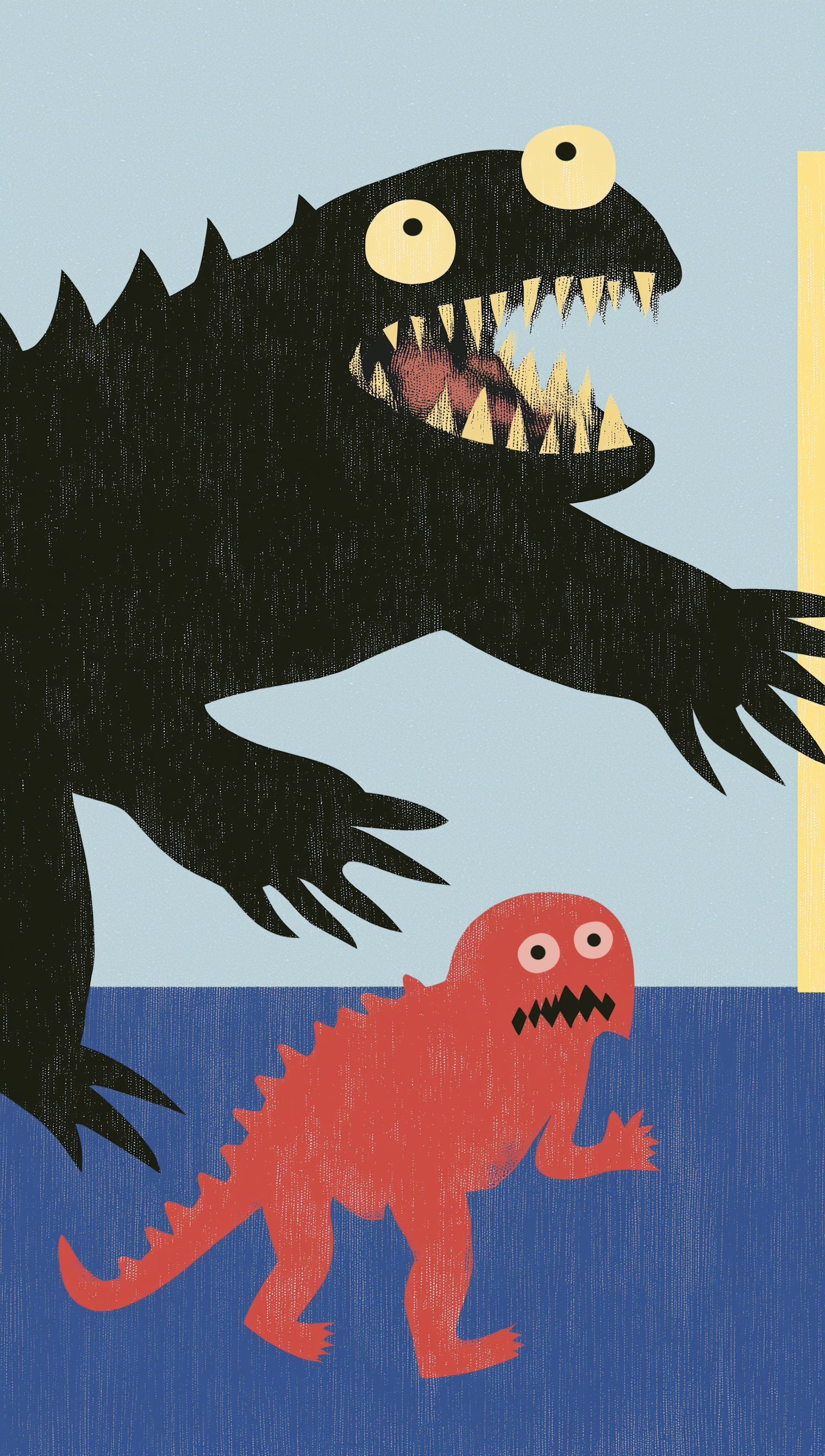 Playful illustration of a large black monster with sharp teeth and a smaller red monster on a blue background.
