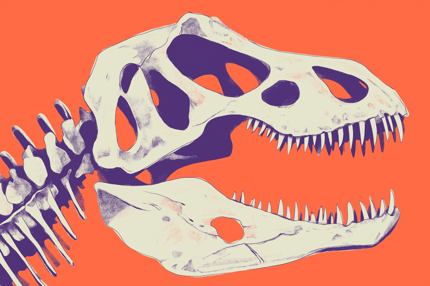 Stylized dinosaur skull illustration with sharp teeth and vibrant orange background, blending white and purple tones for a bold contrast.
