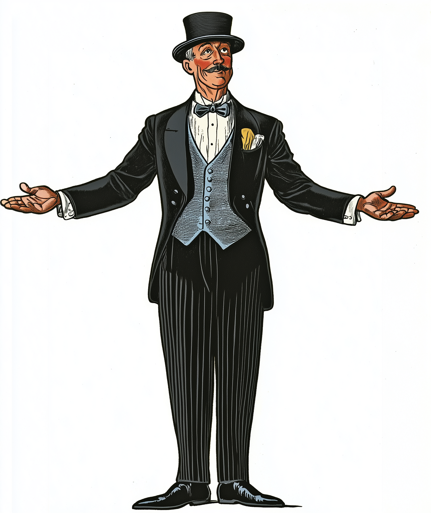 Elegant gentleman in a tuxedo and top hat, arms outstretched in a welcoming gesture, exuding classic sophistication.