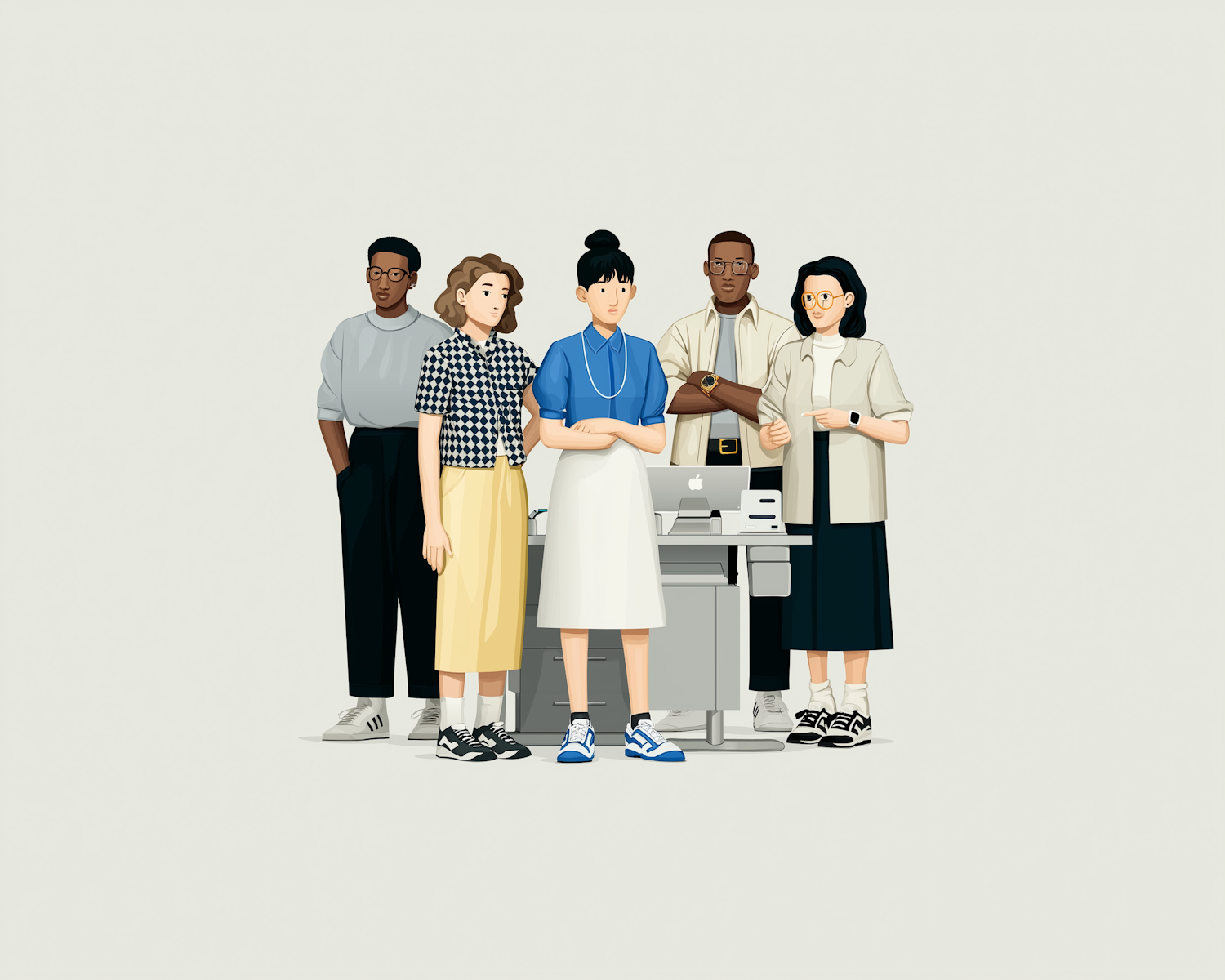 Illustration of a diverse group of professionals in a modern office setting, dressed in casual attire, standing near a desk with a computer.