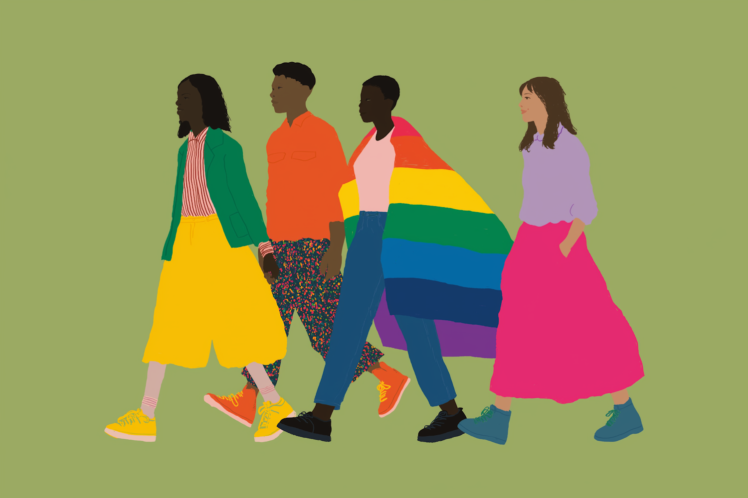 A vibrant illustration of four individuals walking together, showcasing colorful outfits and a rainbow flag, symbolizing LGBTQ+ pride and unity.