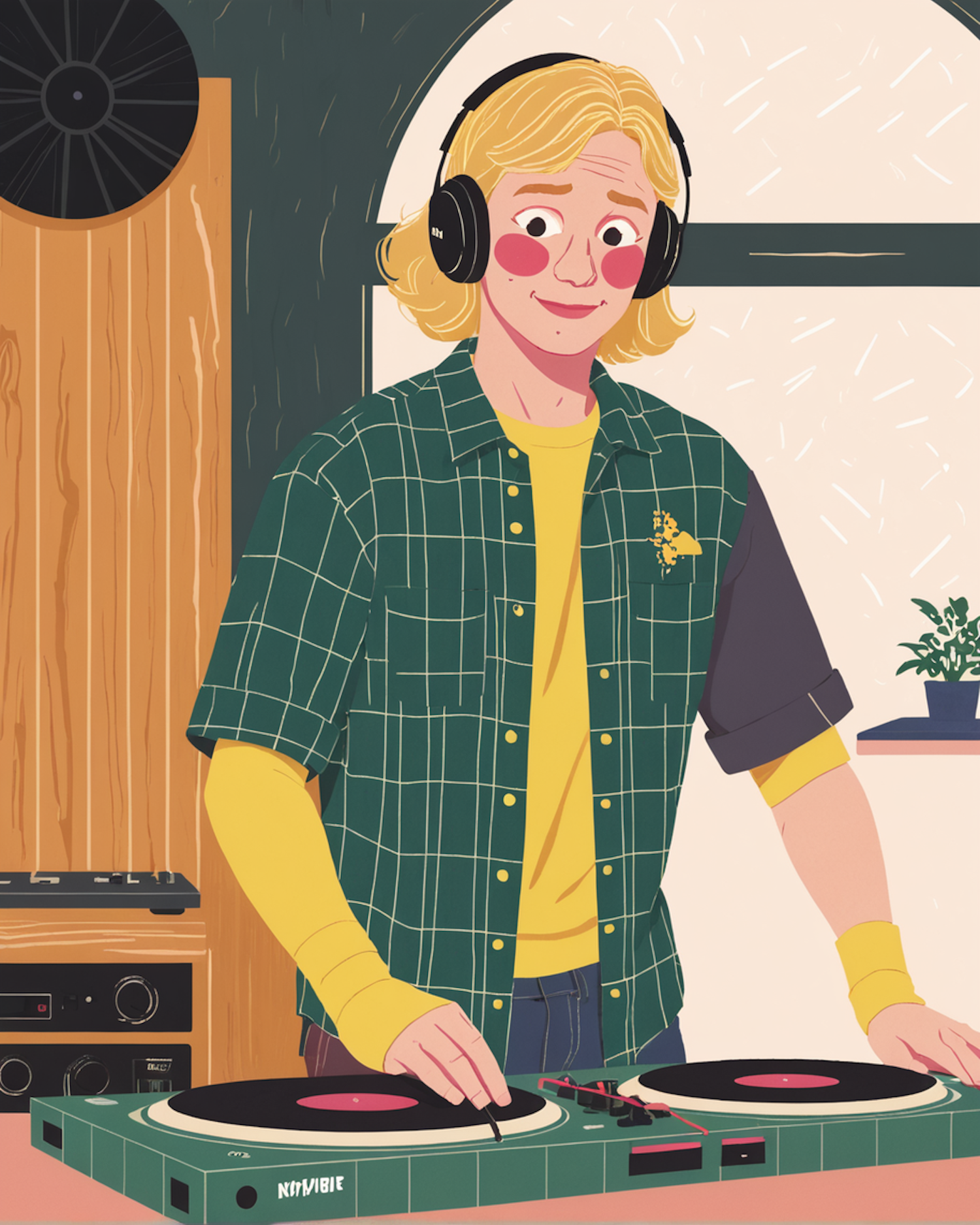 Illustration of a young DJ with blonde hair mixing music on turntables, wearing headphones and a green checkered shirt.