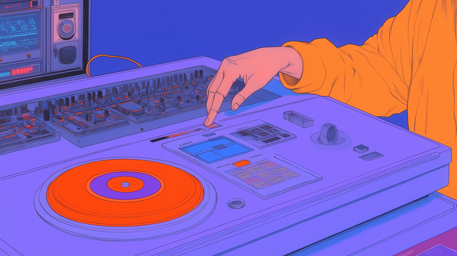 Vibrant DJ setup illustration with a colorful turntable and hand poised to mix. Bright orange and purple hues create an energetic vibe.