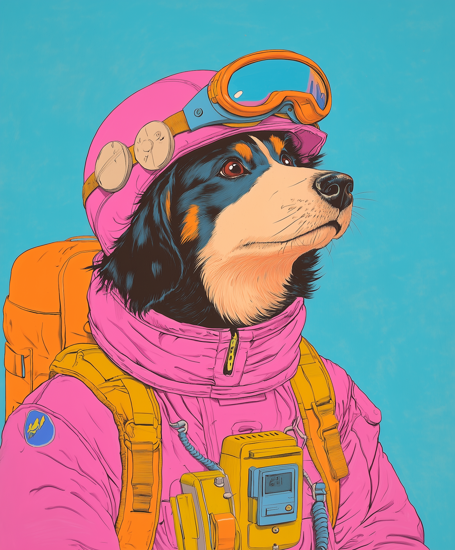 Whimsical illustration of a dog in a pink astronaut suit with gadgets and goggles, set against a light blue background.