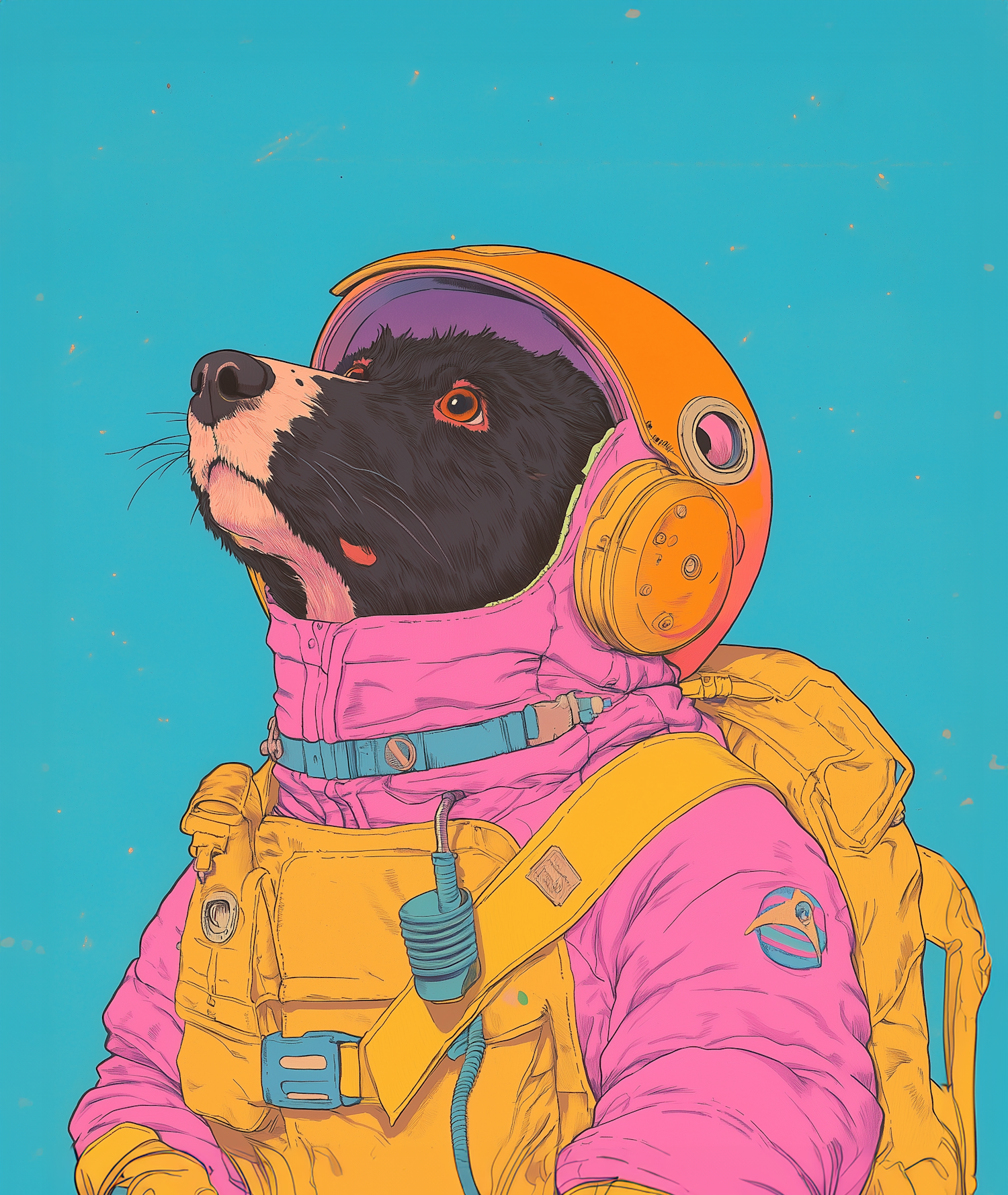 A black and white dog in a vibrant pink and yellow astronaut suit gazes upward against a turquoise background. Whimsical and adventurous.