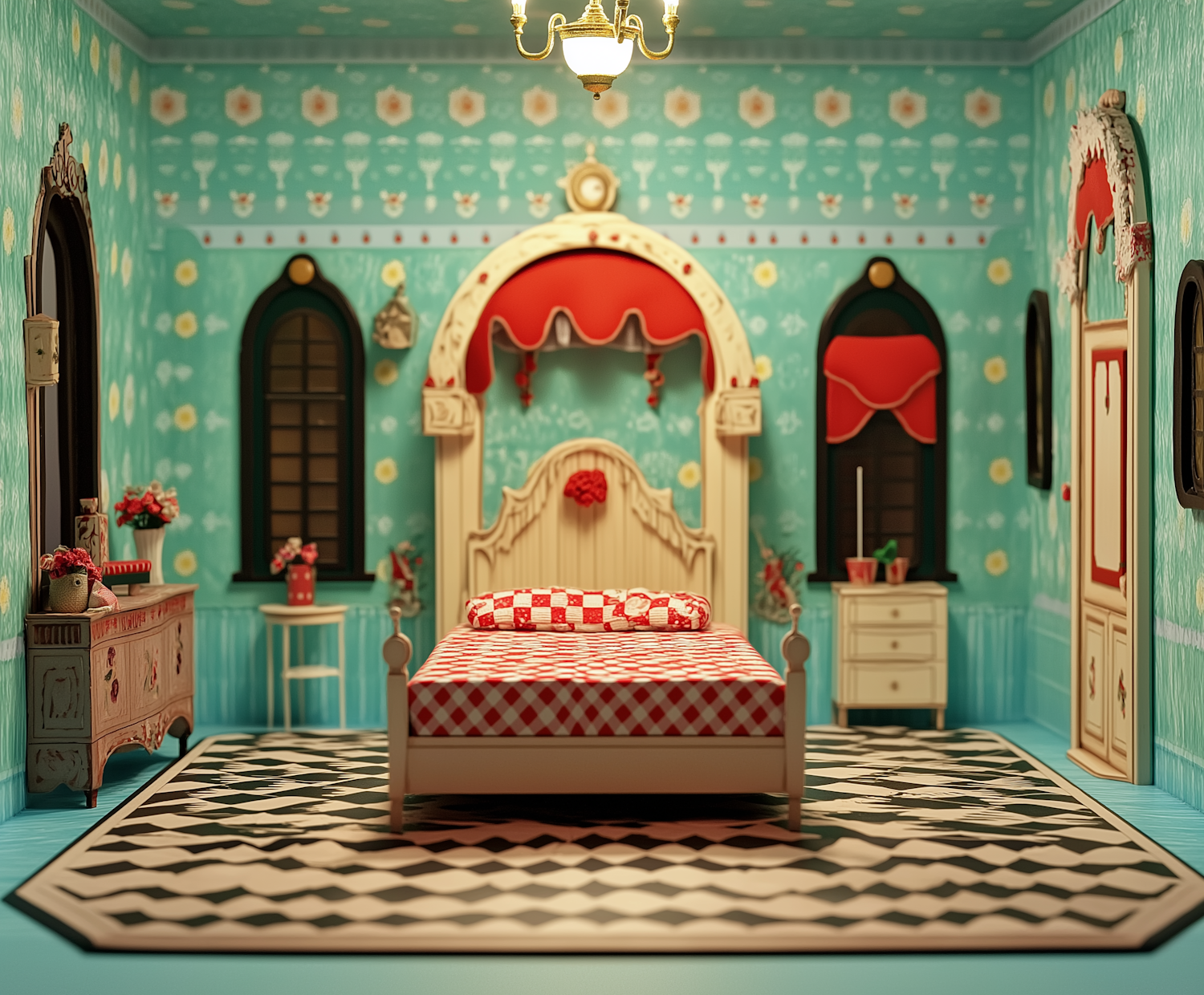 Whimsical vintage bedroom with teal floral walls, checkered bedspread, and elegant arched windows. Charming and playful decor.