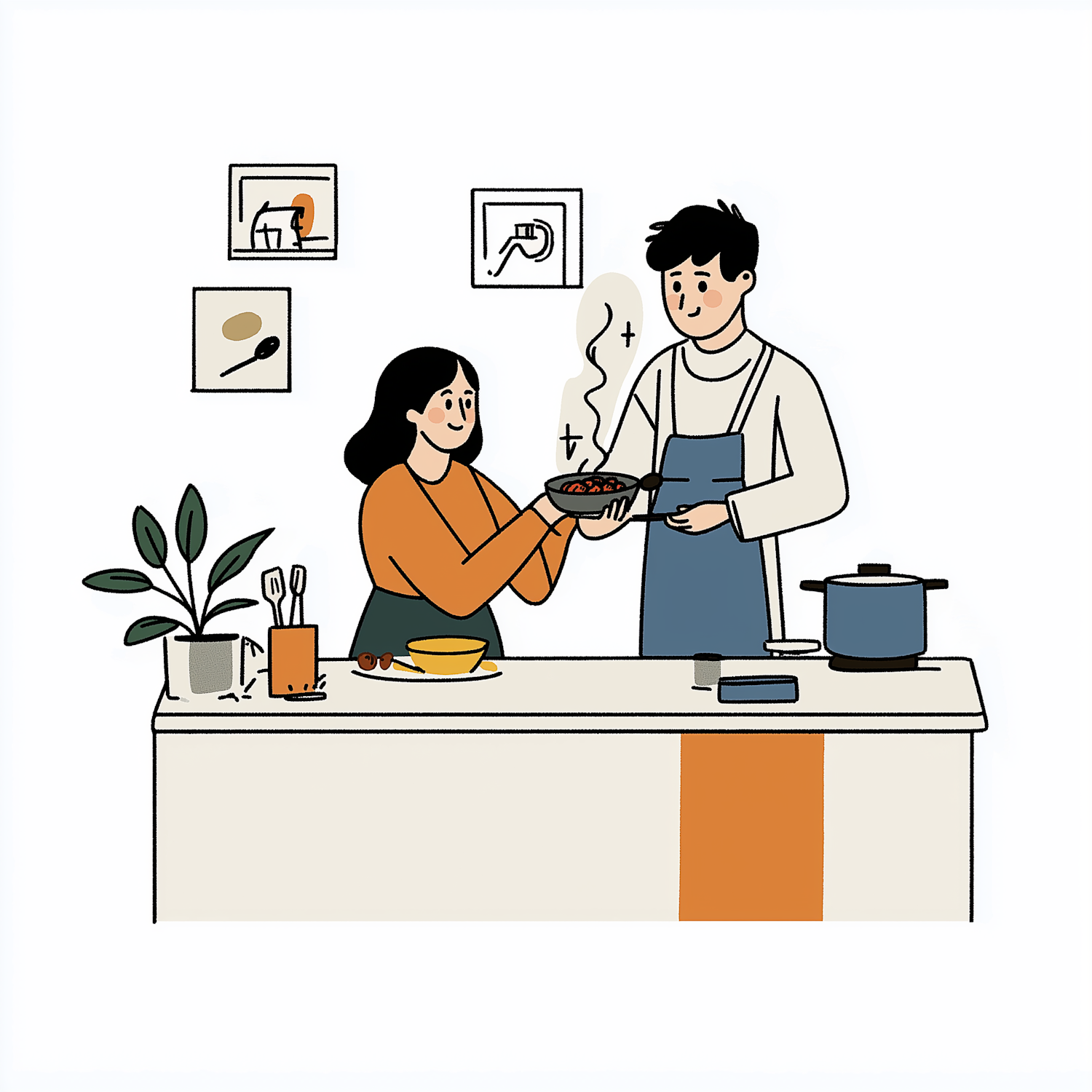 Charming kitchen illustration with two characters cooking together, featuring a cozy atmosphere and playful decor.