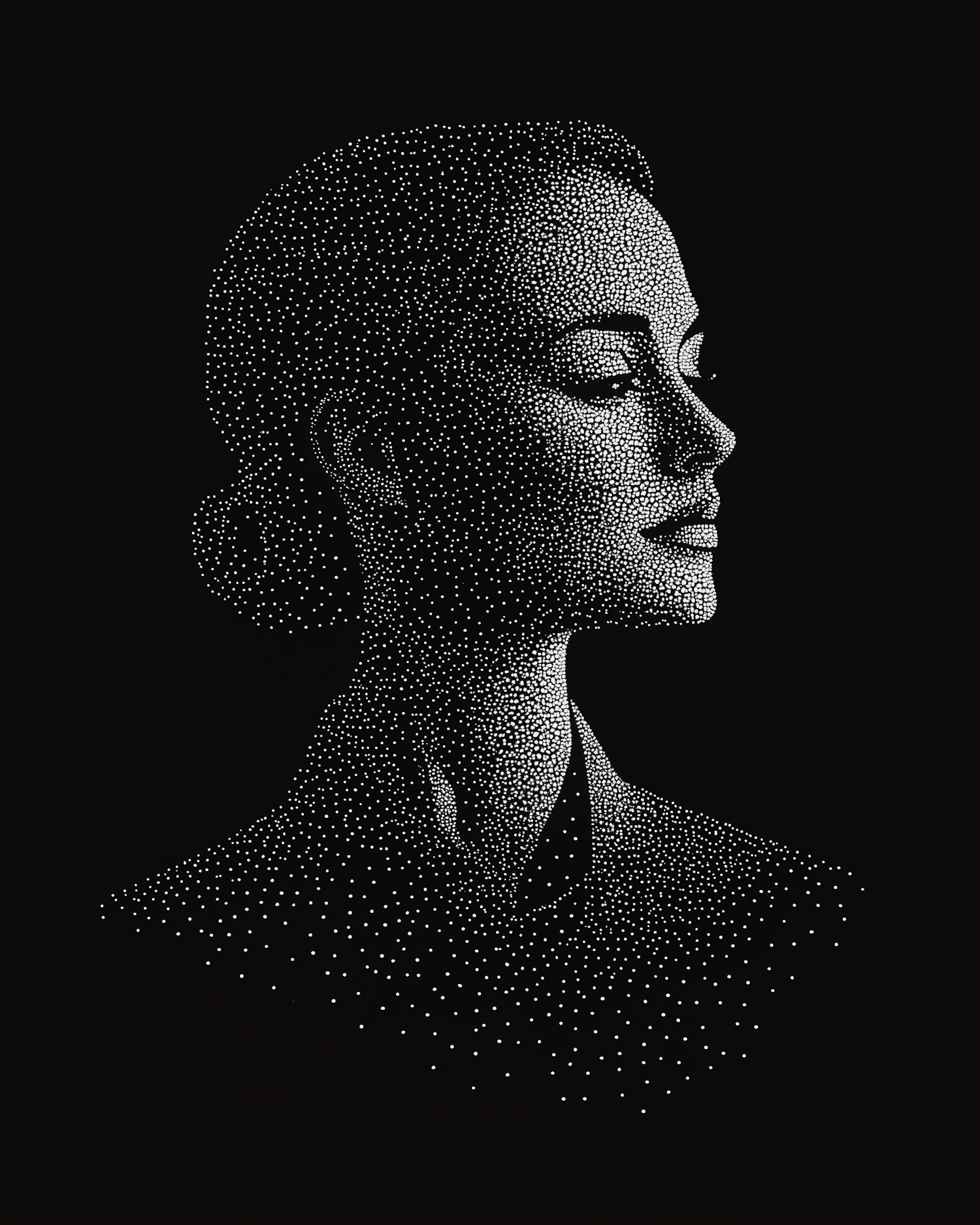 Elegant dot art of a woman's profile on a black background, showcasing intricate details and minimalist design.