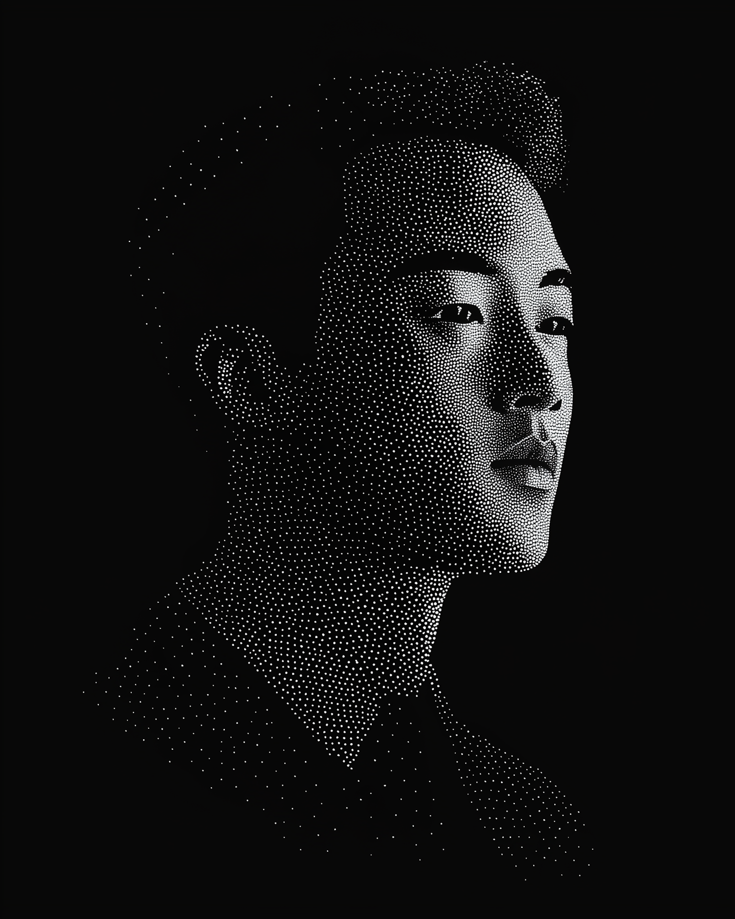 Abstract dot art of an Asian face in profile, created with white dots on a black background, showcasing a minimalist and futuristic design.