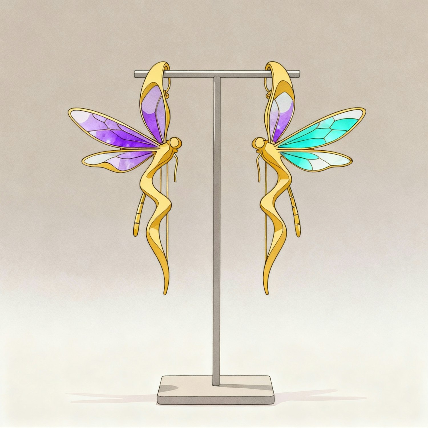 Elegant dragonfly-shaped earrings with golden bodies and colorful stained-glass wings, displayed on a minimalist stand.