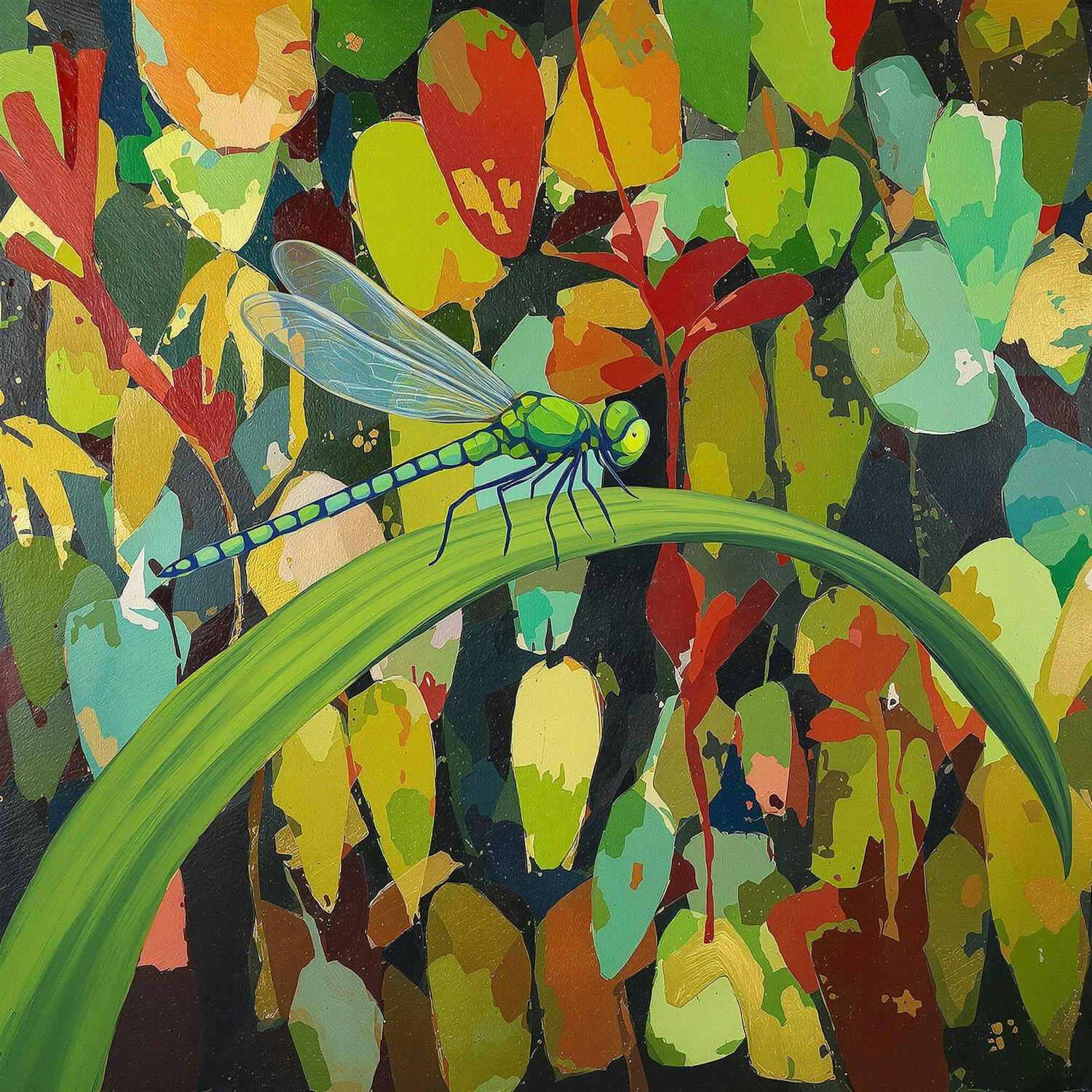 An abstract expressionist oil painting using thick heavy paint and brush strokes.The subject is a large green dragonfly with transparent wings perched on a long arched green blade of grass that spans across the entire lower portion of the canvas. The background is an out of focus lush colorful array of plant-like shapes, with touches of red and gold interspersed with the varying shades, an example of nature’s camouflage.