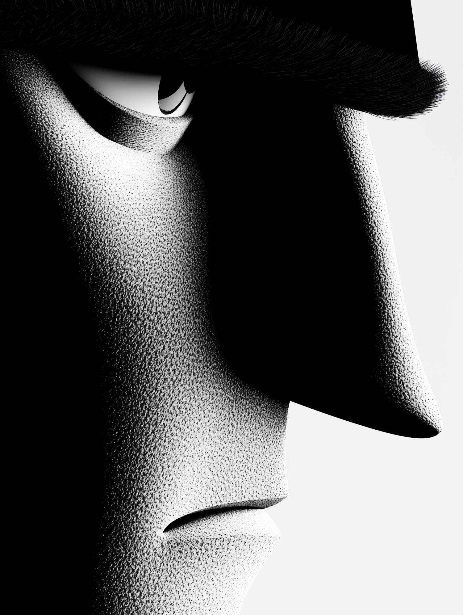 High-contrast black and white illustration of a mysterious face in profile, featuring a textured surface and expressive eye.