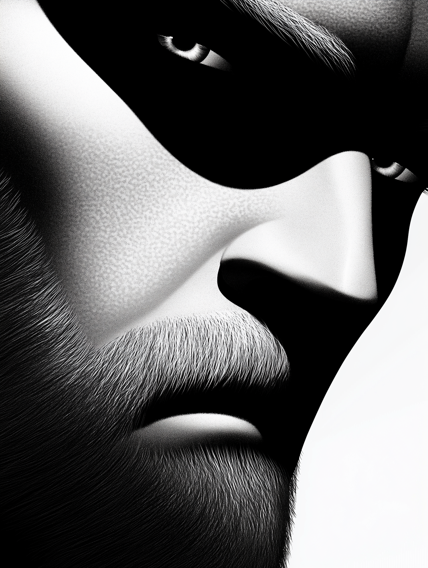 High-contrast black and white illustration of a man's intense gaze and detailed beard, emphasizing texture and dramatic lighting.