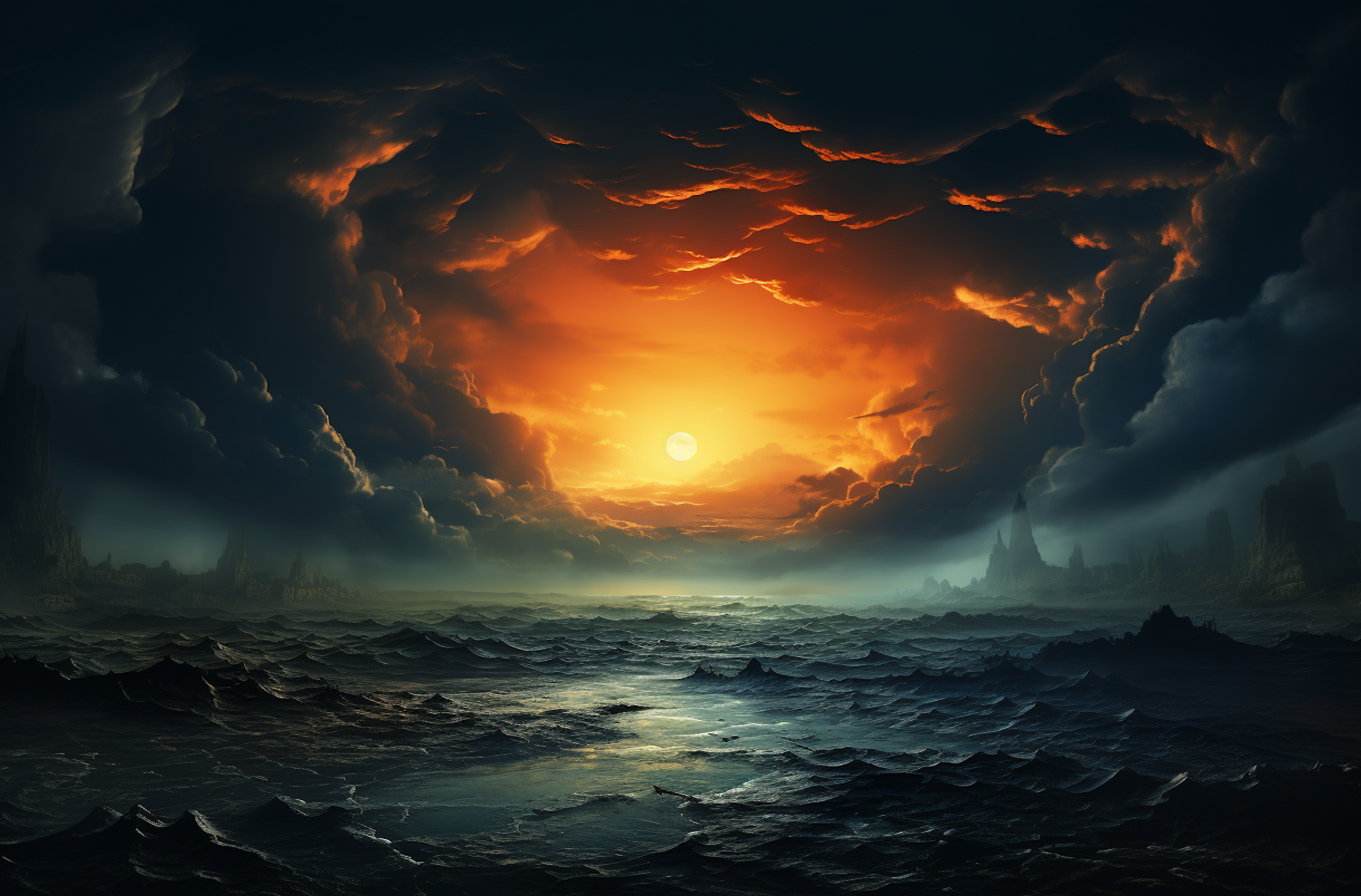 Dramatic seascape with turbulent waves and a fiery sky, featuring dark clouds and distant rock formations under a glowing horizon.