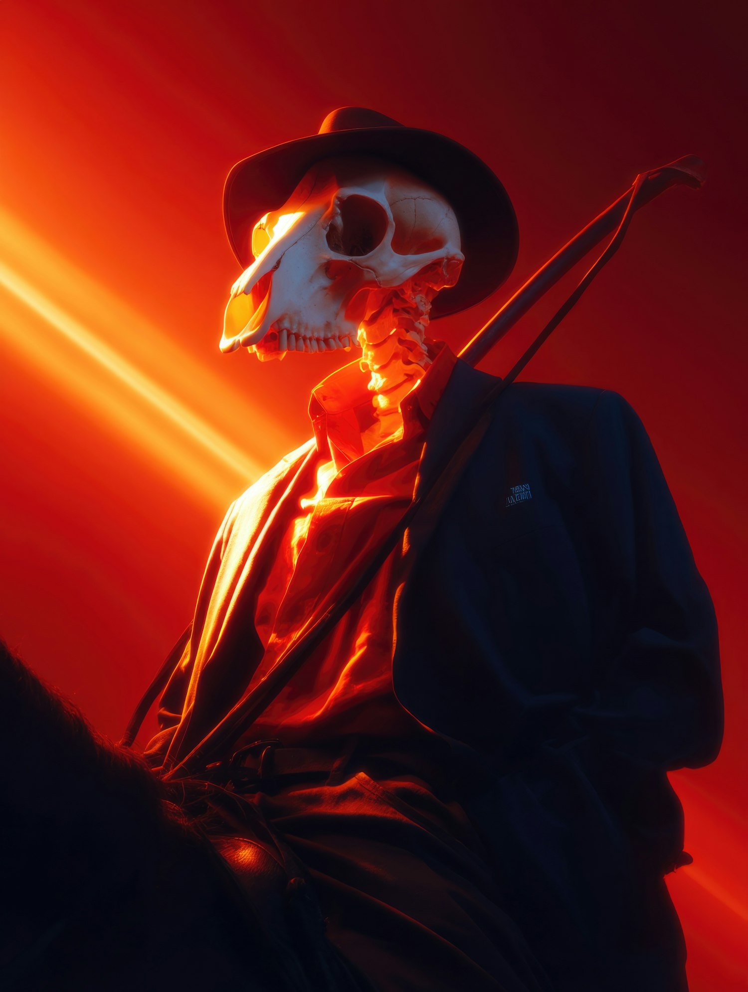 A dramatic artistic scene of a figure with a skull head wearing a hat and formal attire, illuminated in striking fiery hues.