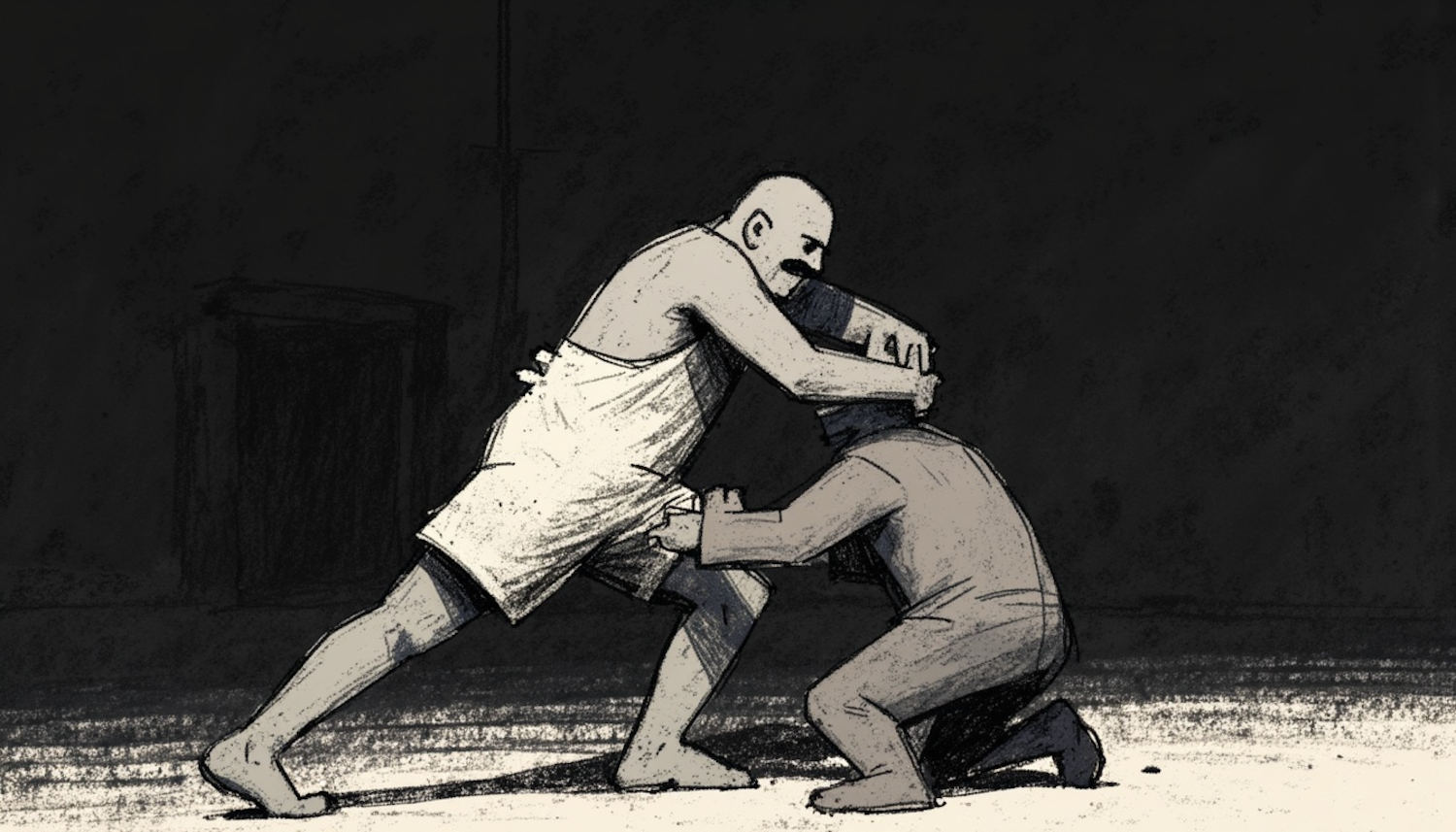 Illustration of two individuals in a physical struggle, one standing in white and the other kneeling in dark attire, set against a dark background.