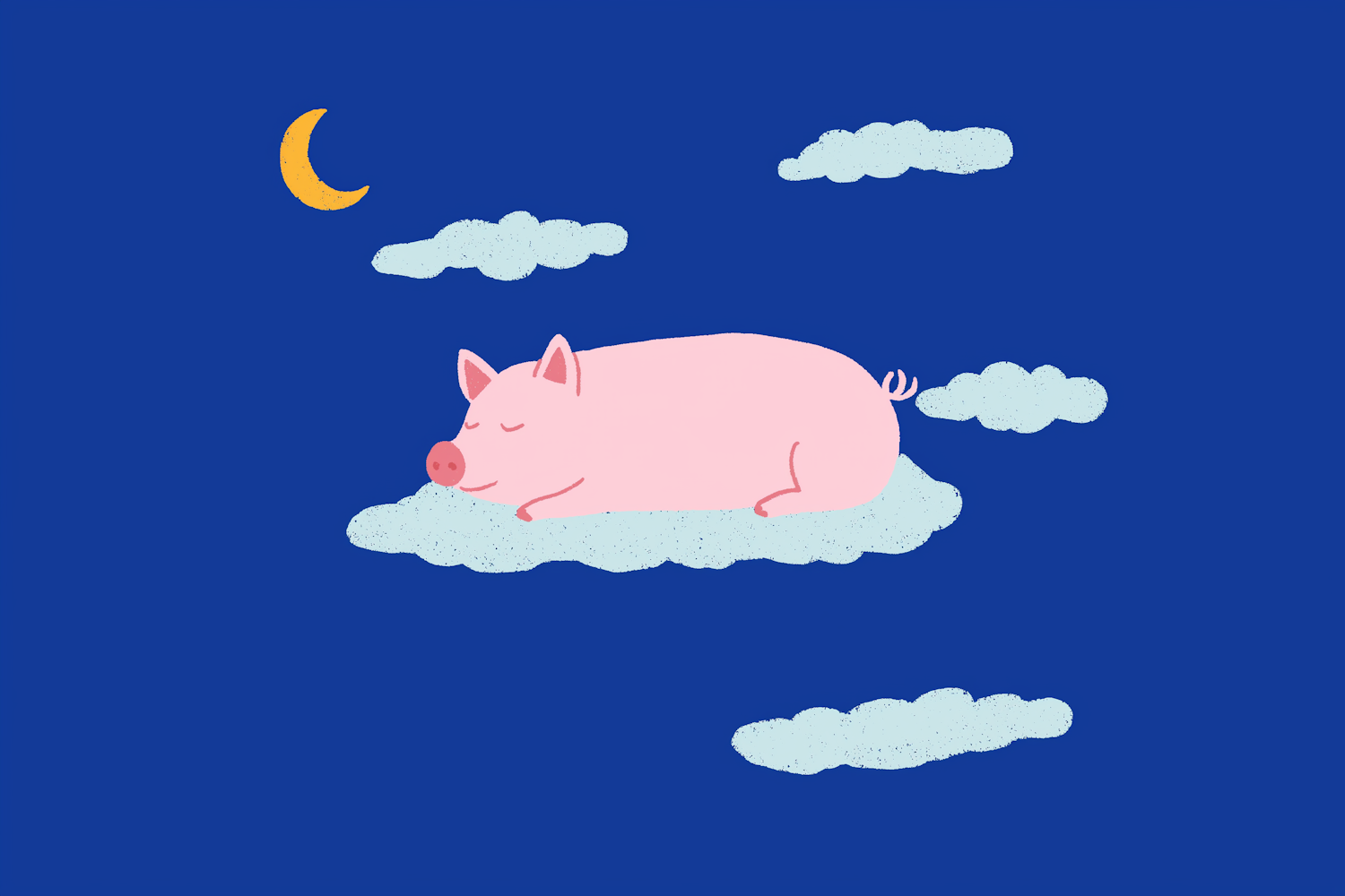 A piglet sleeping on a fluffy cloud with a crescent moon and scattered clouds against a simple blue sky illustration.
