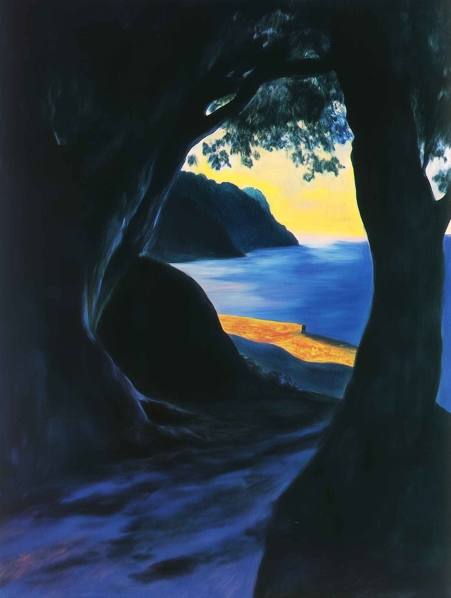 A dreamy view from a shadowy cave opening to a glowing yellow sky, blue water, and a golden sunlit landscape beyond.