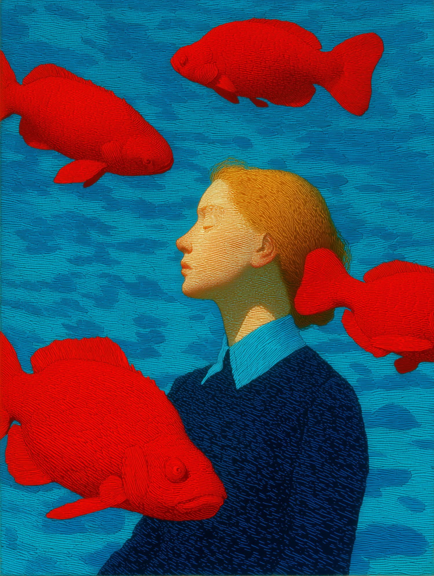 A surreal illustration of a person with closed eyes surrounded by vibrant red fish in a textured blue aquatic background.