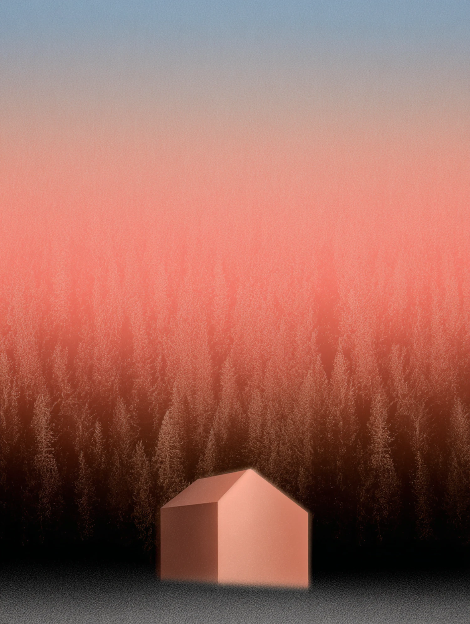 A minimalist illustration of a pink house against a gradient forest background, blending surreal colors and geometric simplicity.