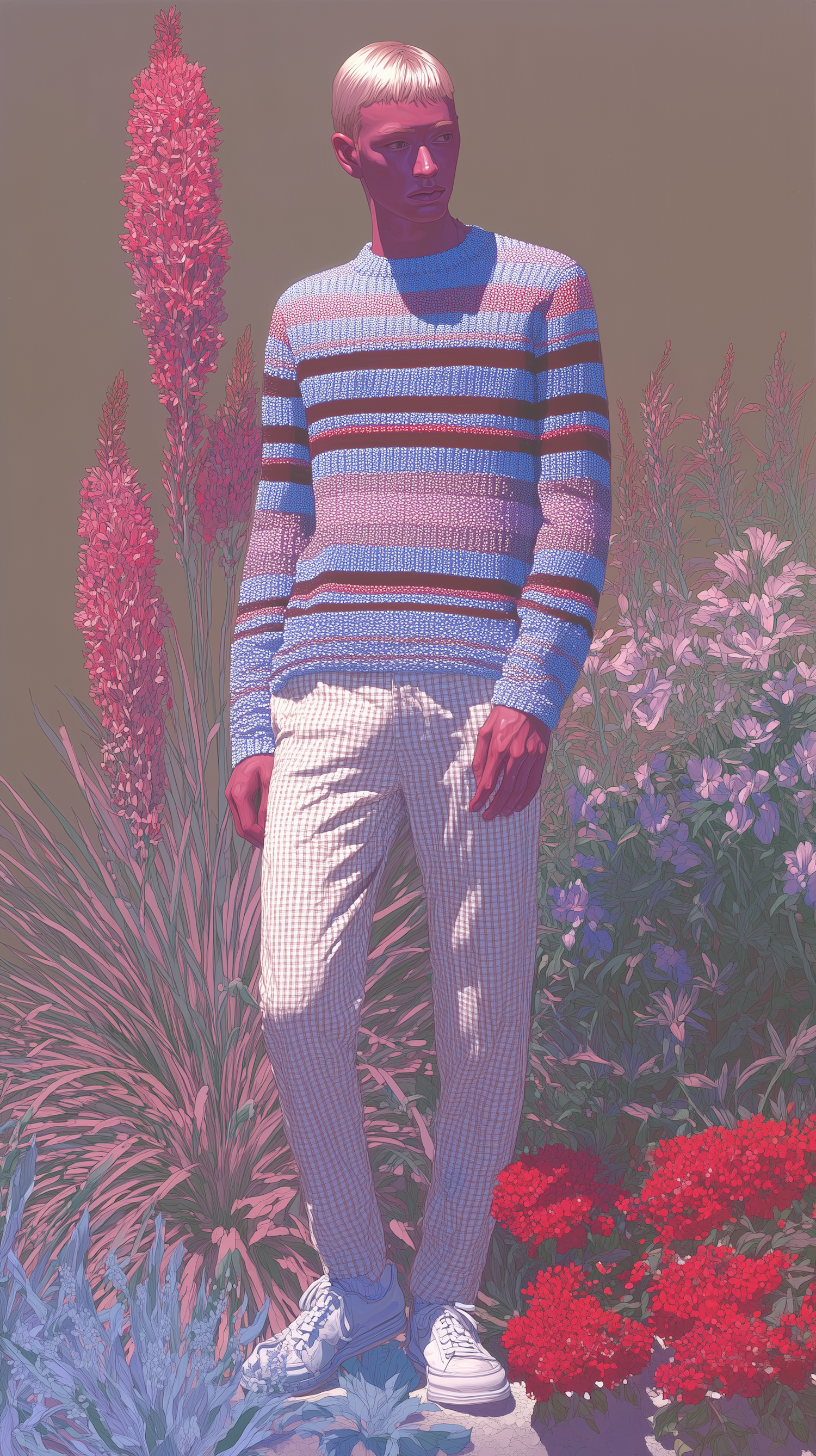 Stylized illustration of a person in a striped sweater amidst a vibrant garden with pink and green hues, creating a surreal atmosphere.
