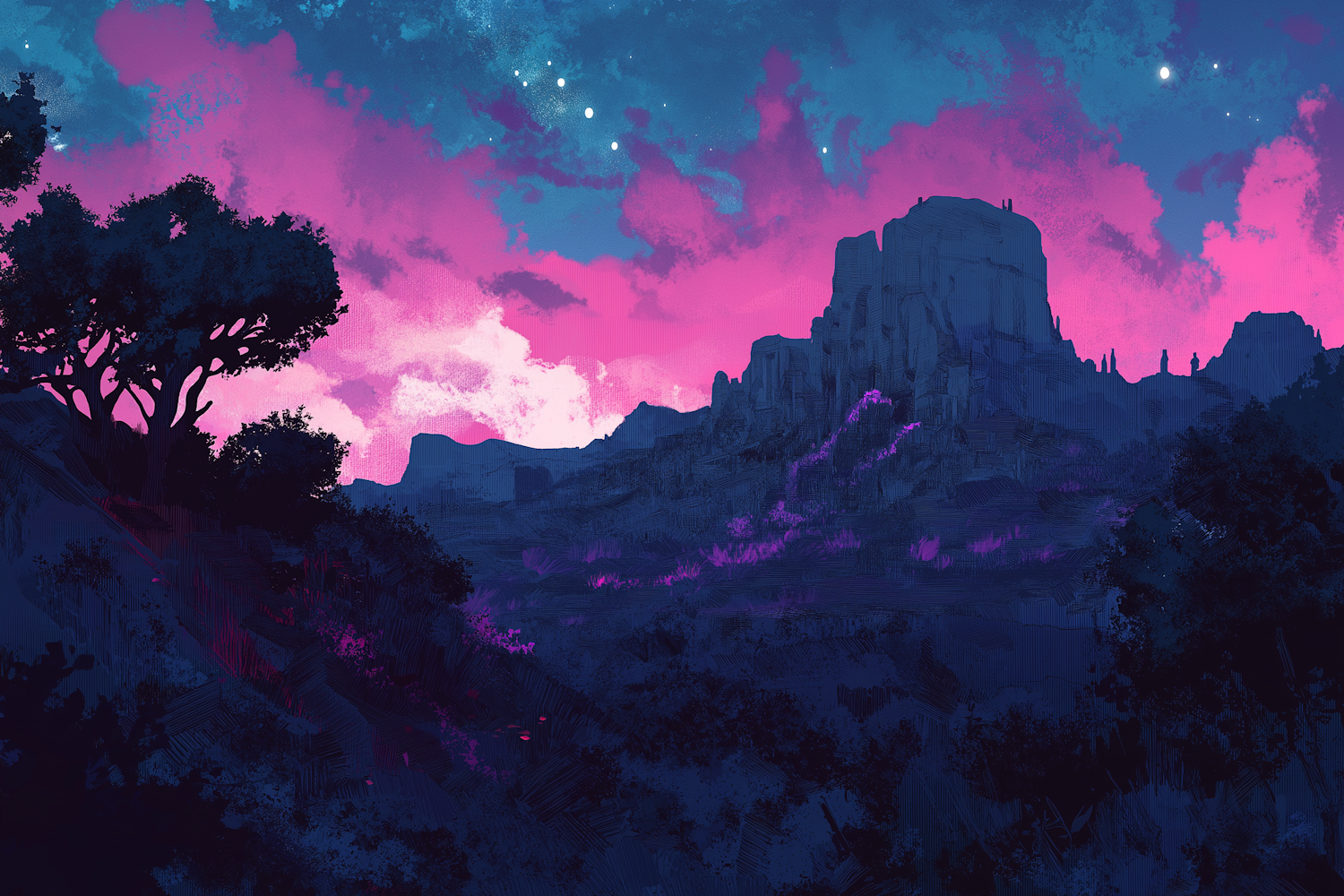 Surreal twilight landscape with vibrant pink and blue sky, silhouetted mountains, and a lone tree. Magical and tranquil atmosphere.