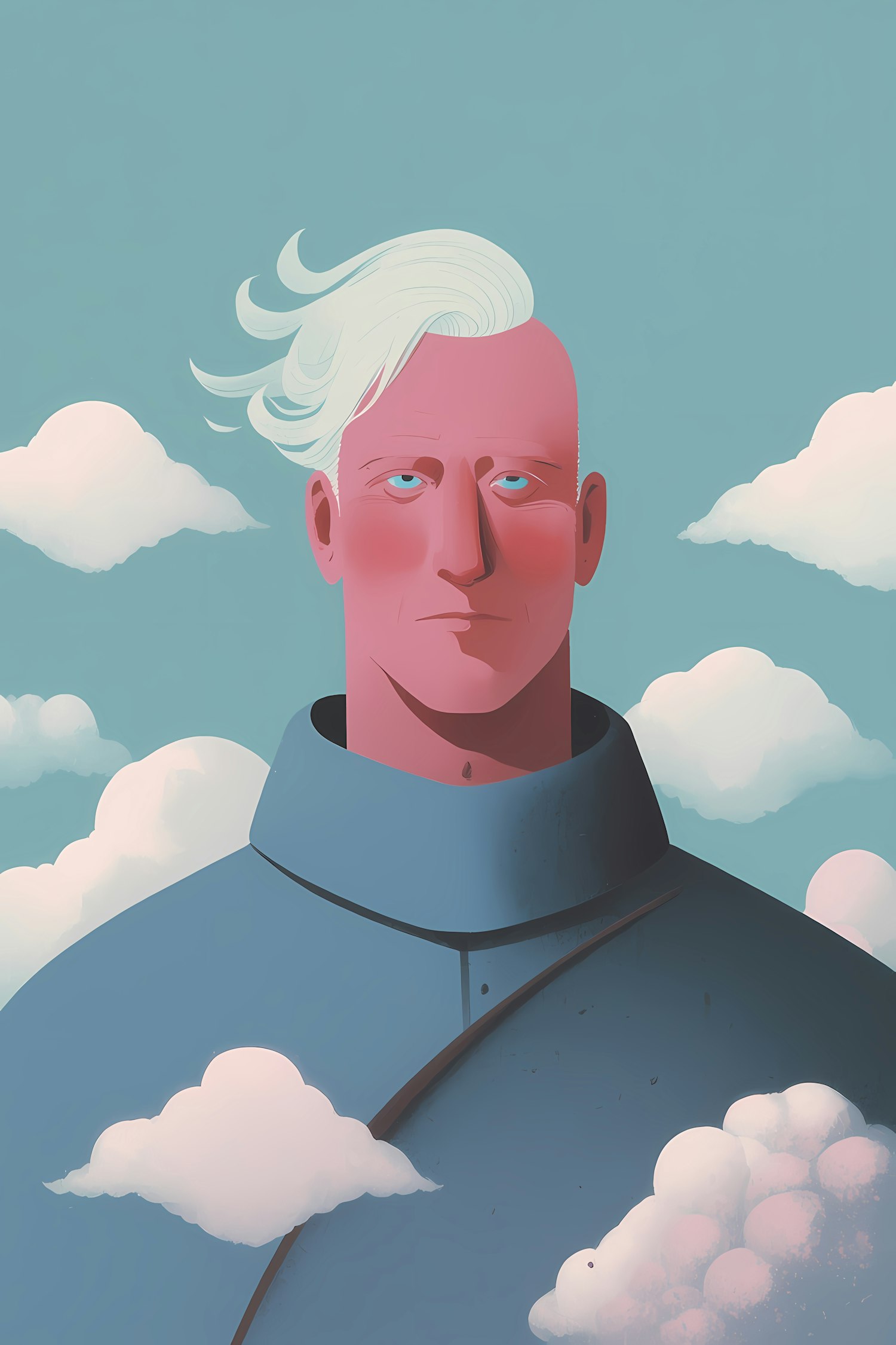 Stylized illustration of a person with white hair and a pinkish complexion, set against a blue sky with fluffy clouds, evoking a serene mood.