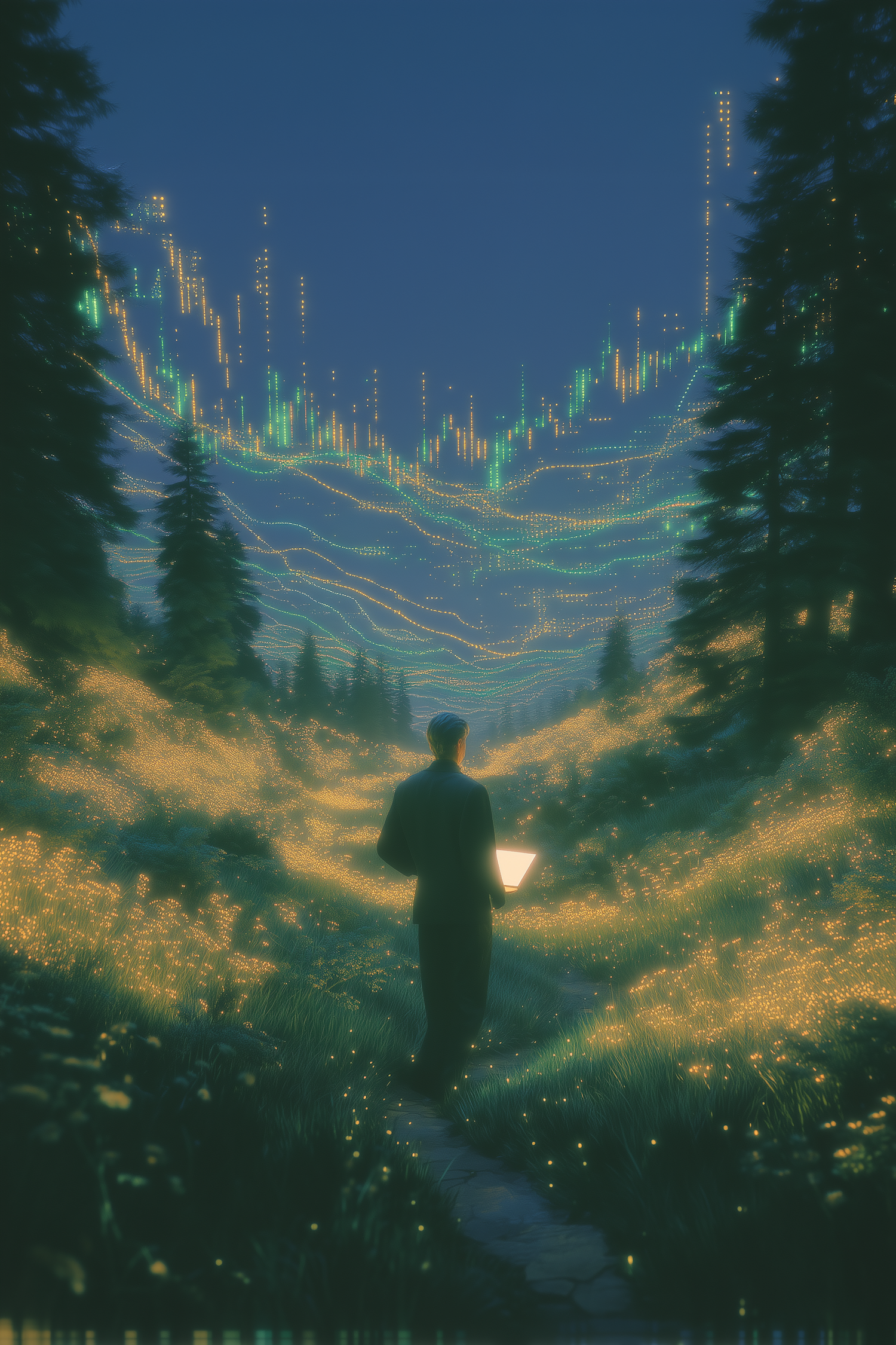 A person in a glowing meadow at night, holding a laptop, with a sky filled with data-like light patterns. A blend of nature and technology.