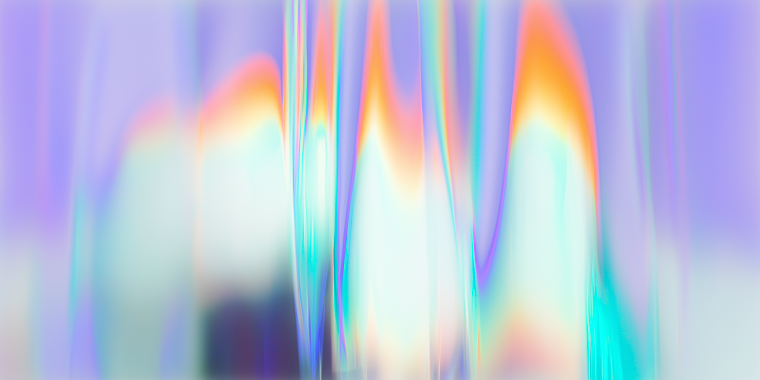 Abstract art with flowing gradients of purple, blue, orange, and white, creating a dreamy, holographic effect with vertical streaks.